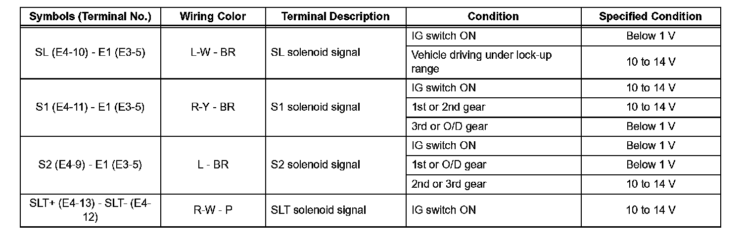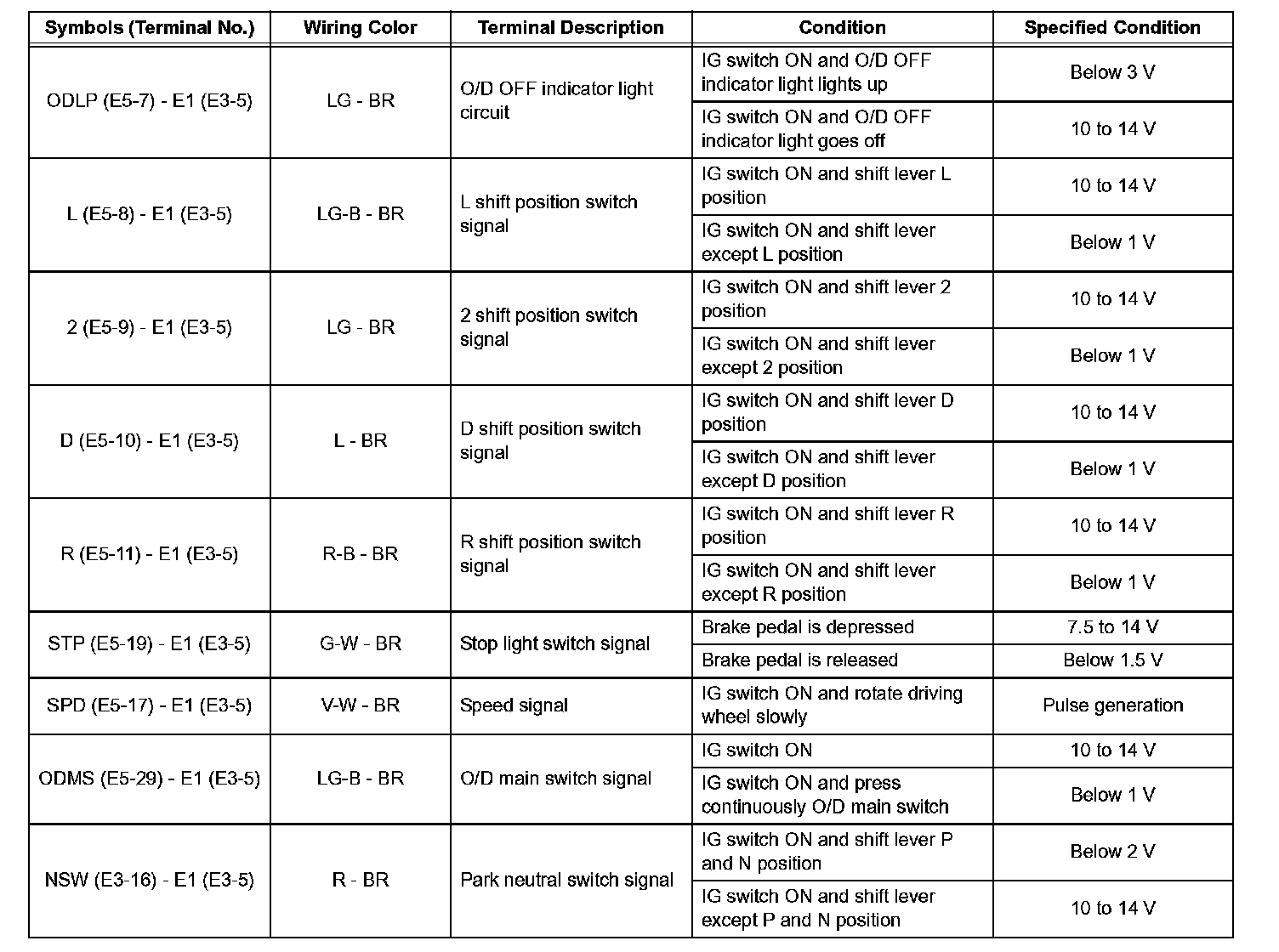 In the table, first follow the information under "Condition". Look under "Symbols (Terminal No.)" for the terminals to inspected. The standard voltage between the terminals is shown under "Specific Condition".