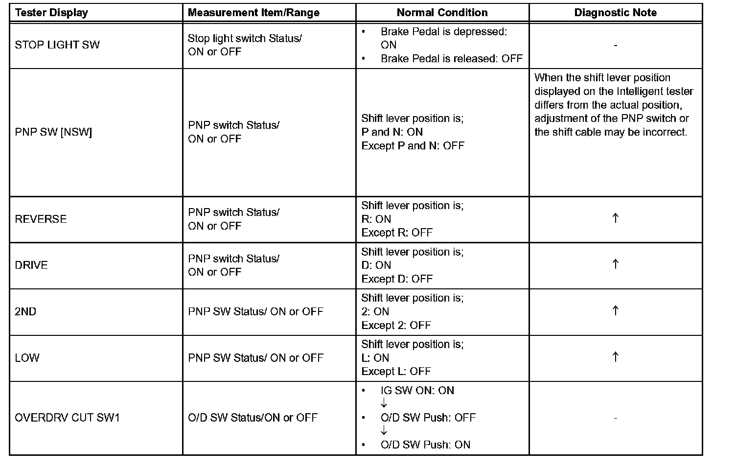 HINT: According to the DATA LIST displayed by the intelligent tester, you can read the value of the switch, sensor, actuator and so on without parts removal. Reading the DATA LIST as the first step of troubleshooting is one method to shorten labor time.
