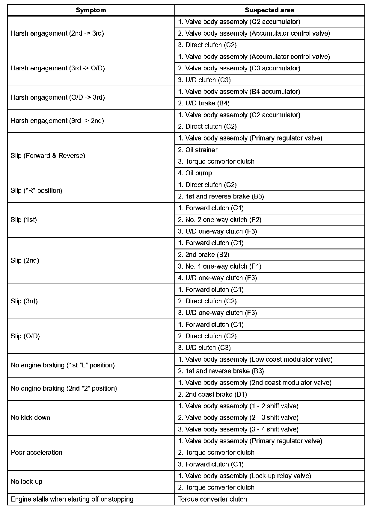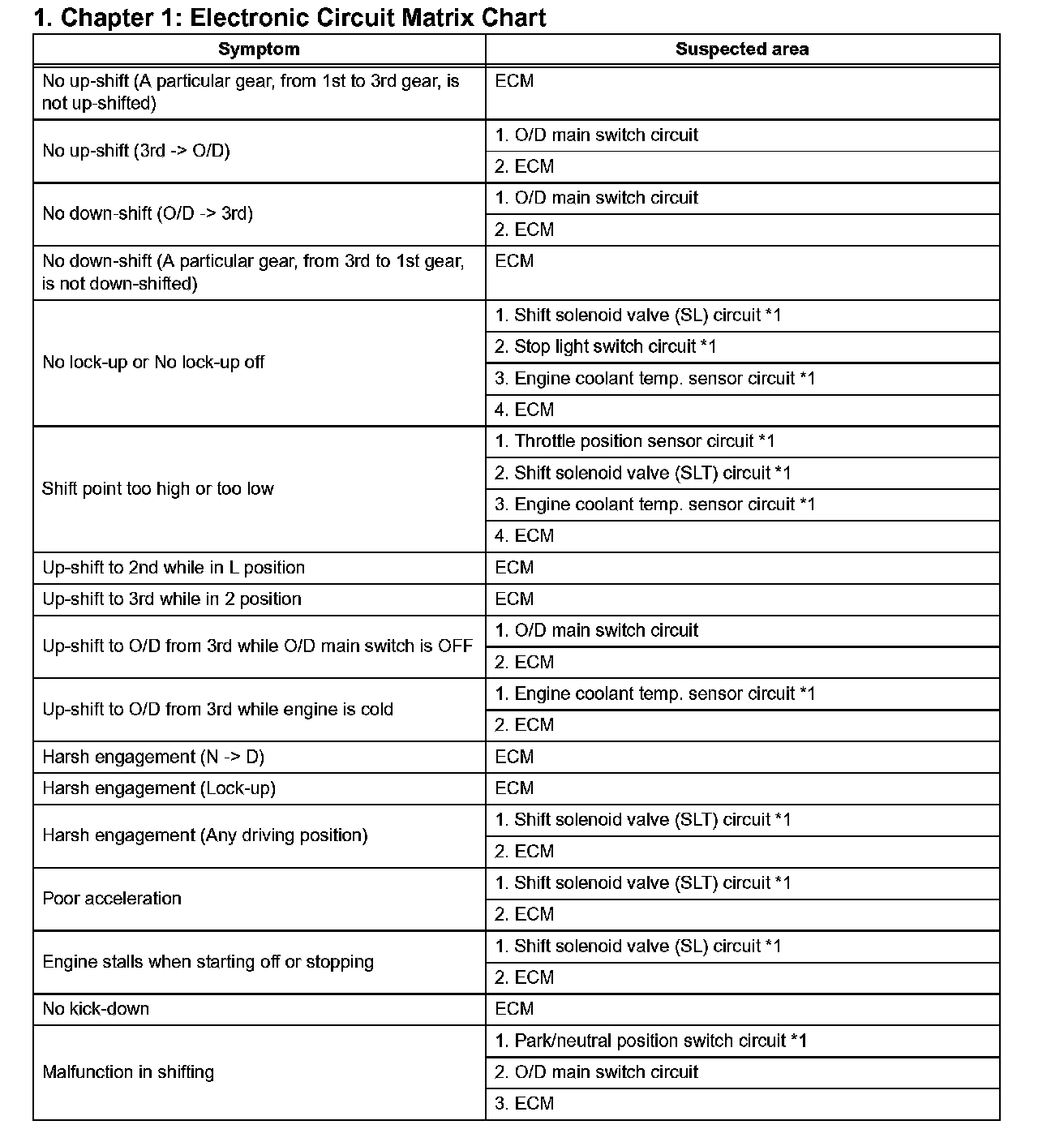 Refer to the table when the trouble cause is considered to be electrical the instruction "Proceed to next circuit inspection shown on matrix chart" is given in the flow chart of each circuit, proceed to the circuit with the next highest number in the table to continue the check. If the trouble still occurs even though there are no abnormalities in any of the other circuits, check and replace the ECM.