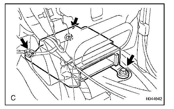- When installing the center airbag sensor assembly, be careful that the SRS wiring does not interfere with other parts and that it is not pinched between other parts.