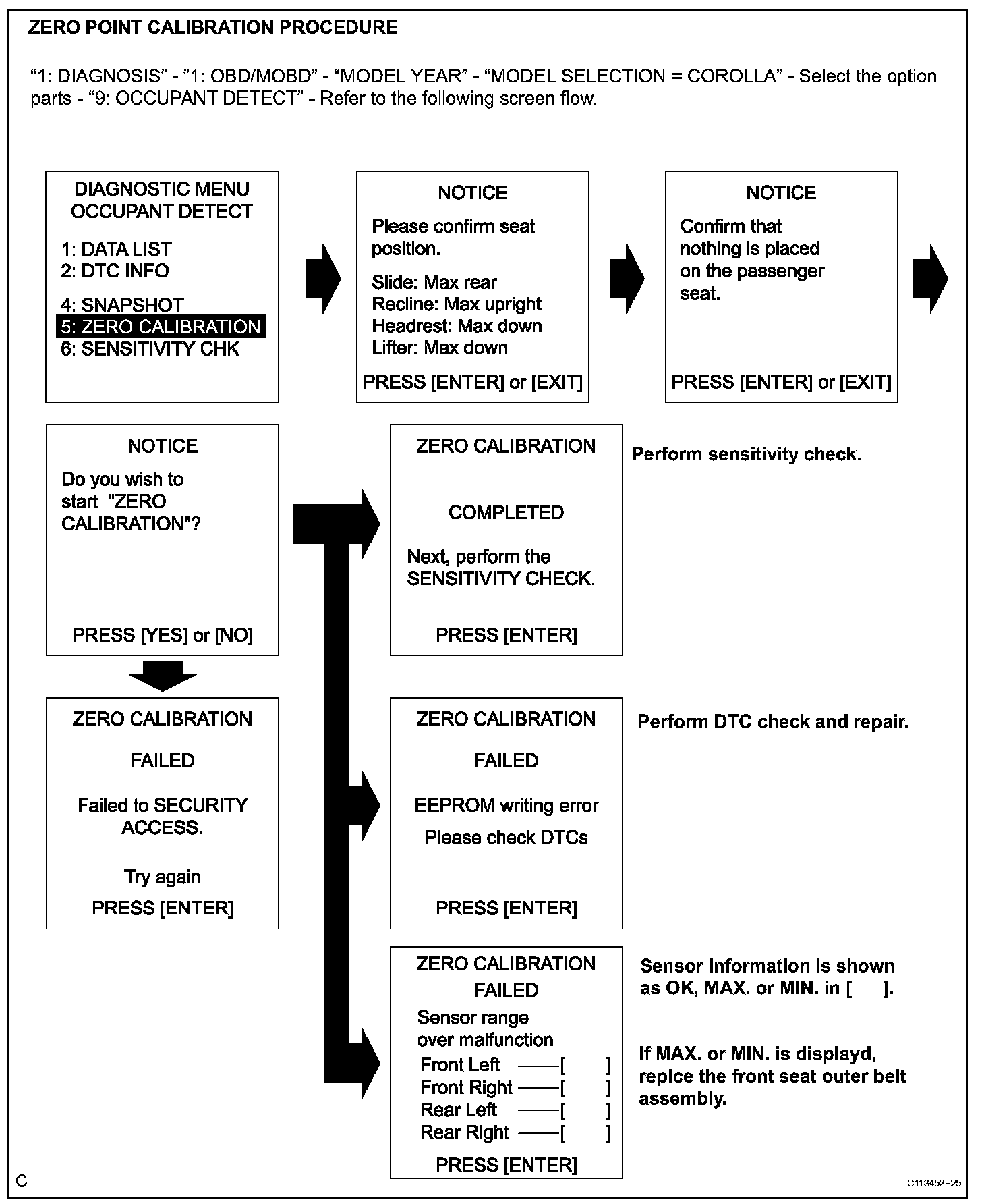 - If zero point calibration has not finished normally, replace the front seat assembly RH.
