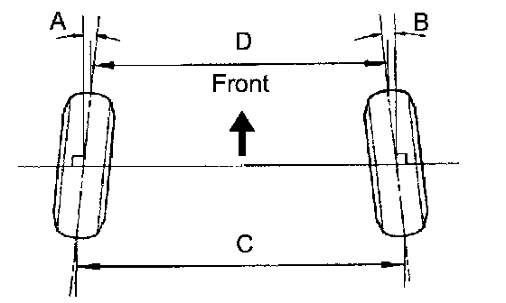 ^ If toe-in is not within the specified range, inspect the suspension parts for damage and/or wear, and replace them if necessary.