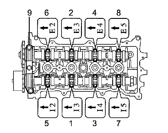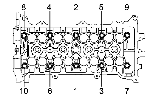 Using several steps, uniformly install and tighten the 10 cylinder head bolts and plate washers with a bi-hexagon wrench 10 mm in the sequence shown in the illustration (Procedure "A").