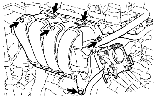 Install the intake manifold and throttle body with the 2 brackets, 4 bolts and 2 nuts.