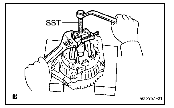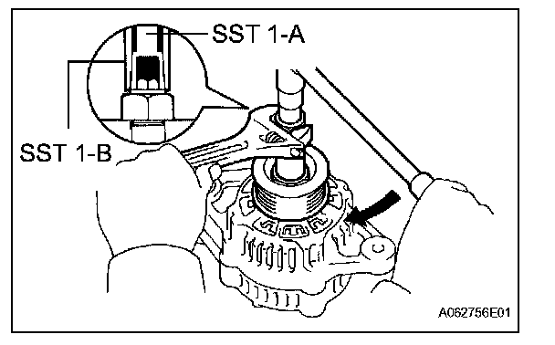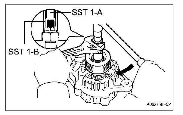 d. To loosen the pulley nut, turn SST 1-A in the direction shown in the illustration.