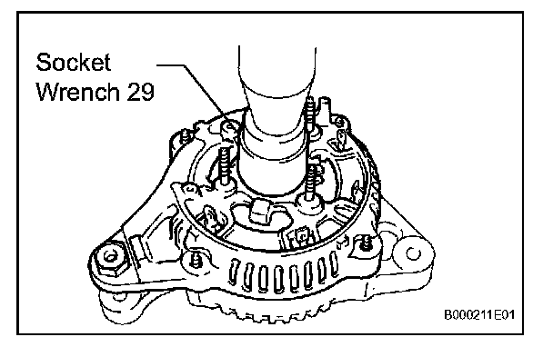 a. Using a socket wrench 29 and a press, slowly push the generator rectifier end frame in.