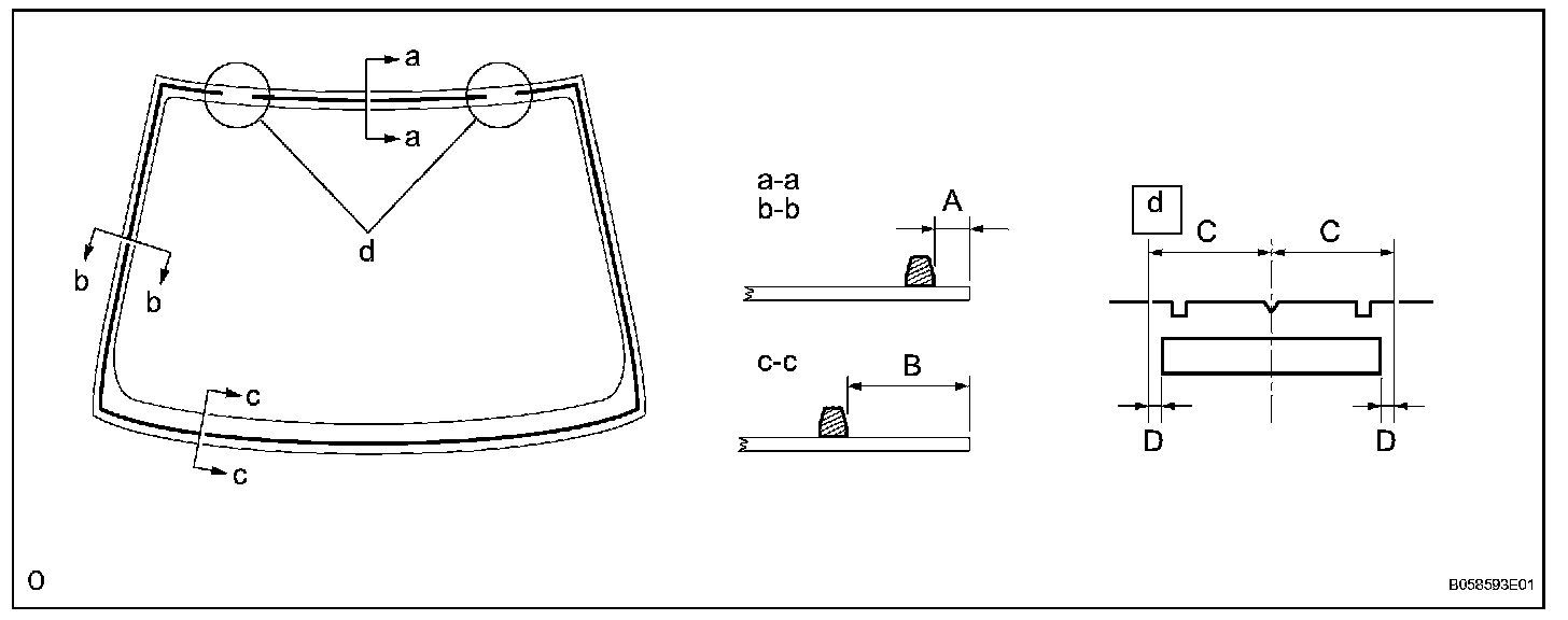 b. Remove the peeling paper from the adhesive part of the dam. Install the dam (adhesive side) to the window glass (Primer G area), but exclude the stopper area "d" as shown in the illustration.