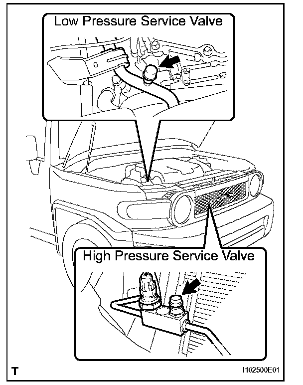 NOTE: Do not start the engine before charging it with refrigerant as the cooler compressor doesn't work properly without sufficient refrigerant. This could cause the compressor to overheat.