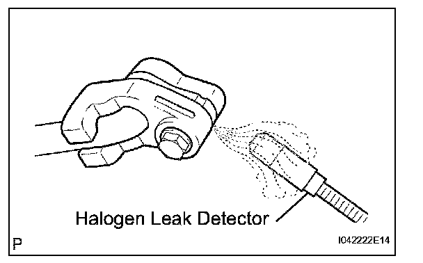 c. Using the halogen leak detector, check the refrigerant line, especially at the connection points, for leakage.
