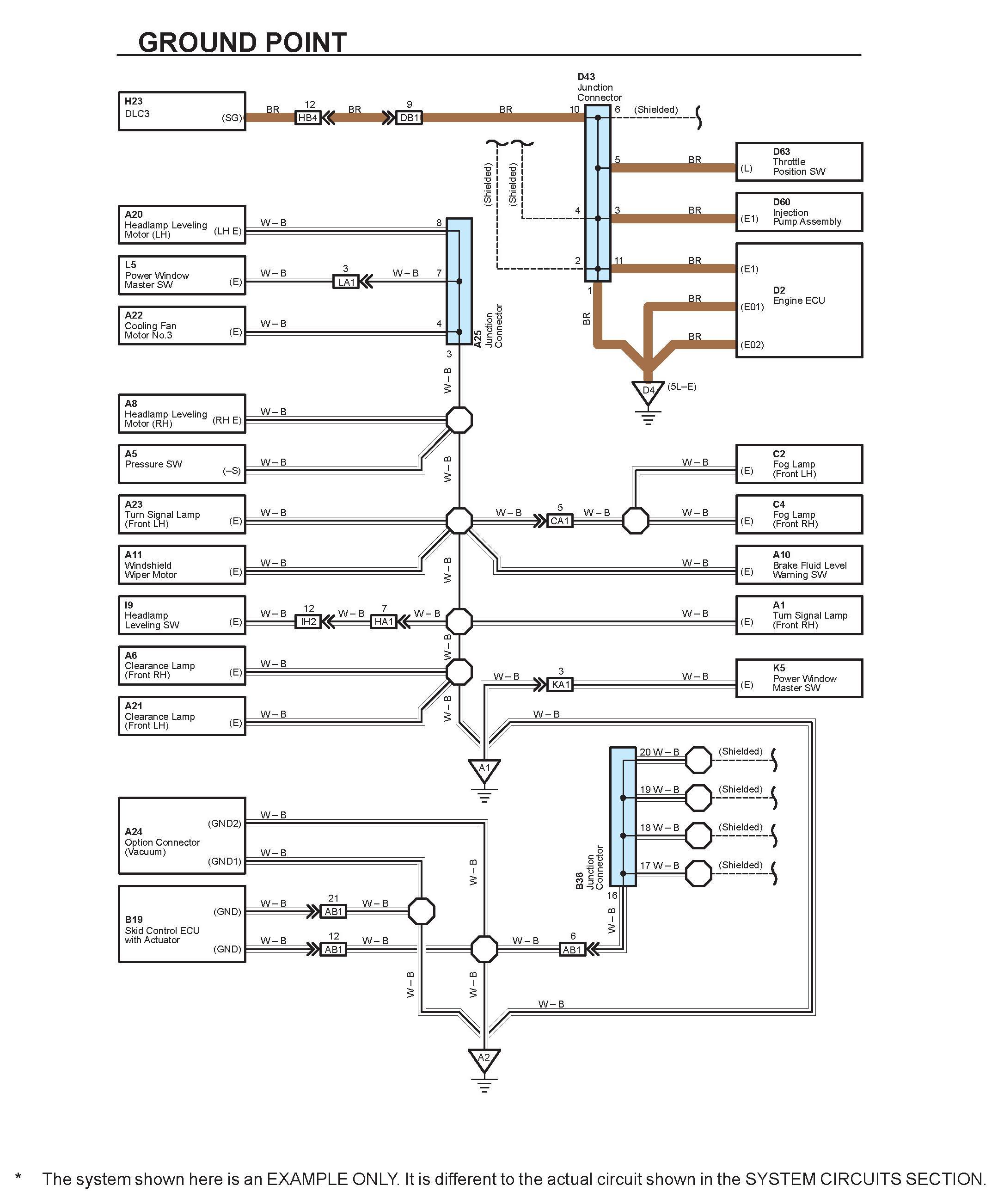 HOW TO READ GROUND POINTSThe ground points circuit diagram shows the connections from all major parts to the respective ground points. When troubleshooting a faulty ground point, checking the system circuits which use a common ground may help you identify the problem ground quickly. The relationship between ground points (A1, A2 and D4 shown) can also be checked this way.