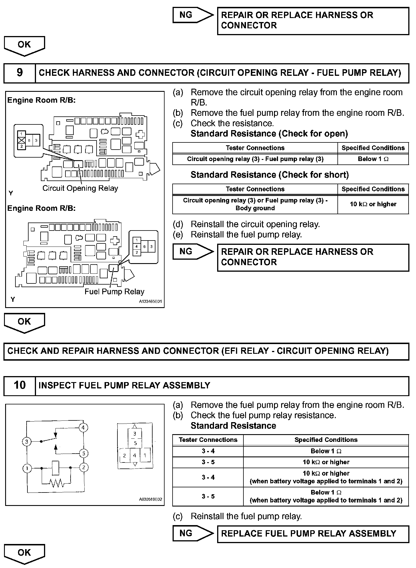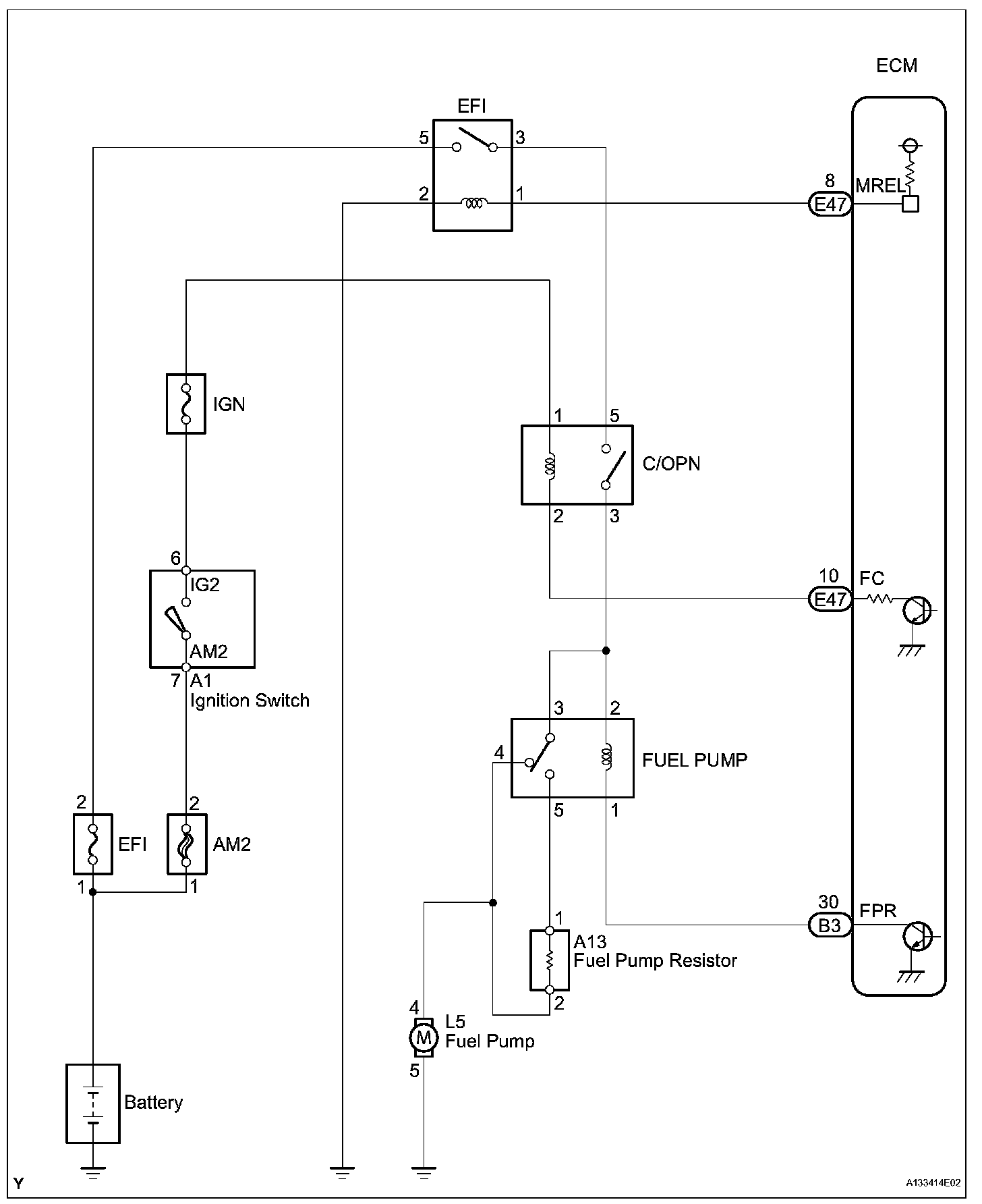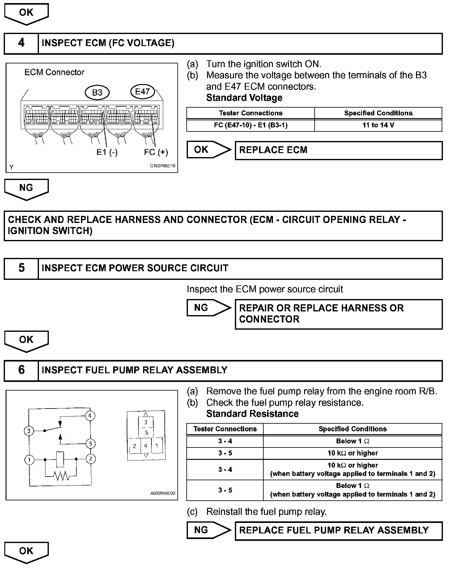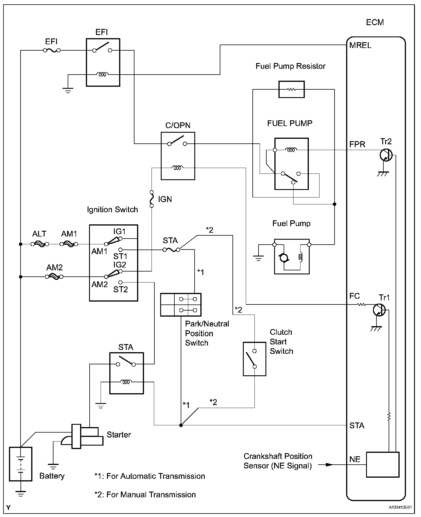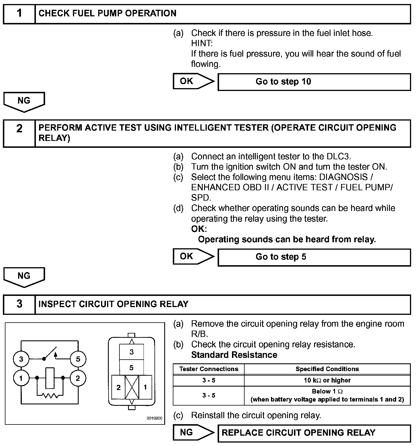 When the STA signal and NE signal are input to the ECM, Tr1 (power transistor 1) is turned ON, current flows to the coil of the circuit opening relay, the relay switches on, power is supplied to the fuel pump, and the fuel pump operates.