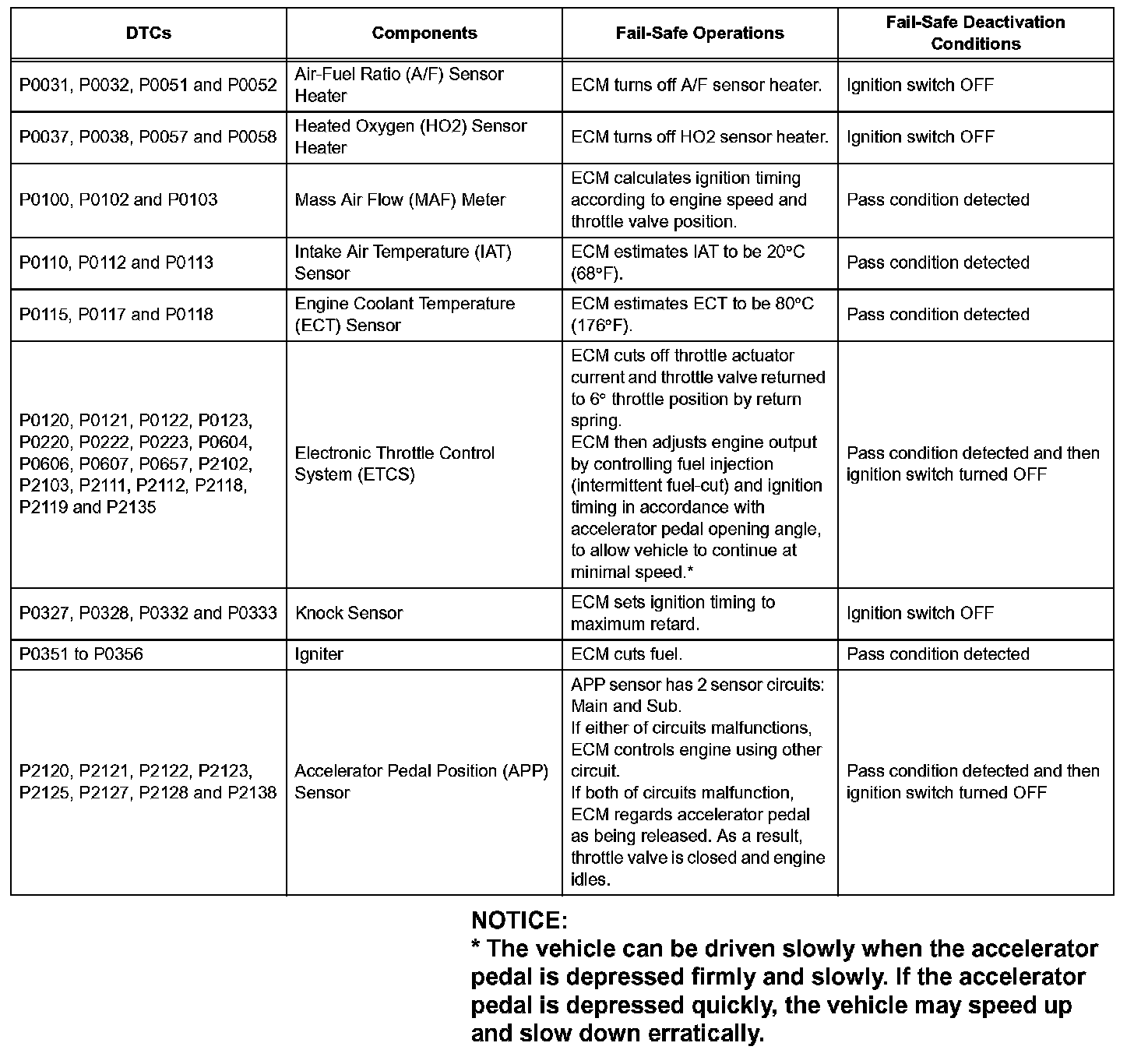 If any of the following DTCs are set, the ECM enters fail-safe mode to allow the vehicle to be driven temporarily.