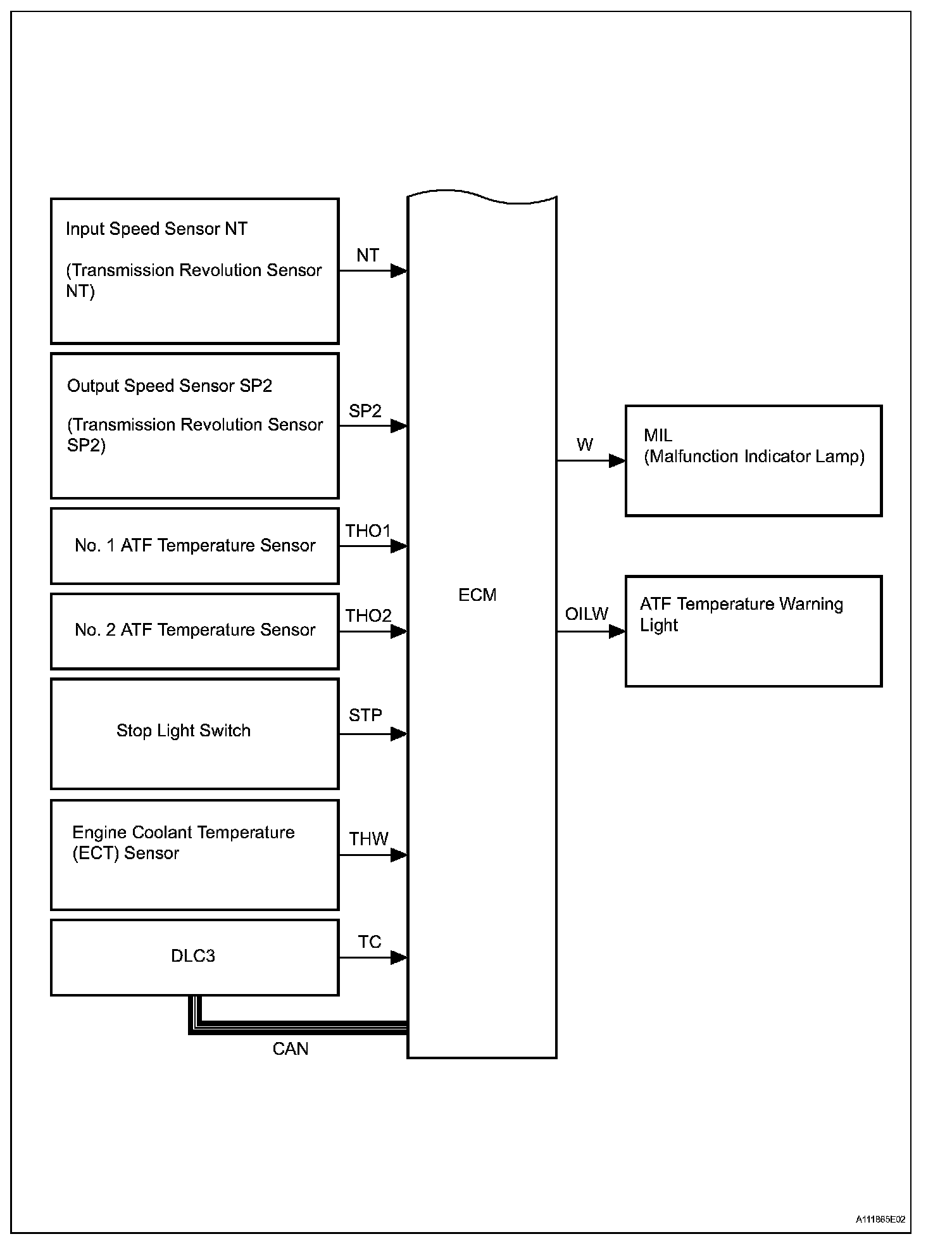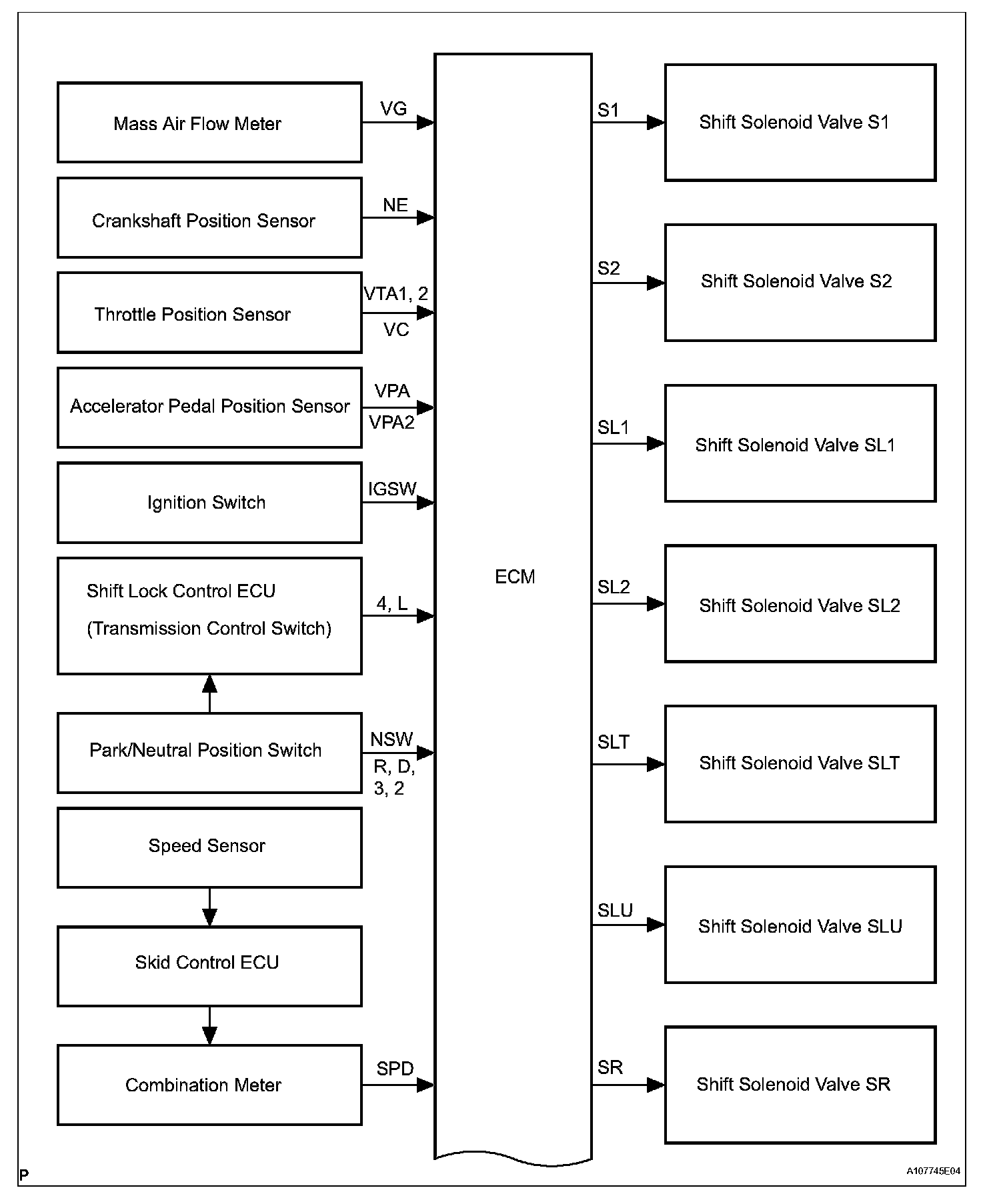 SYSTEM DIAGRAMThe configuration of the electronic control system in the A750E automatic transmission is as shown in the following chart.