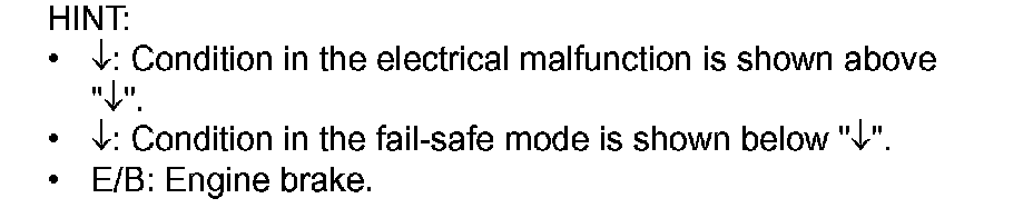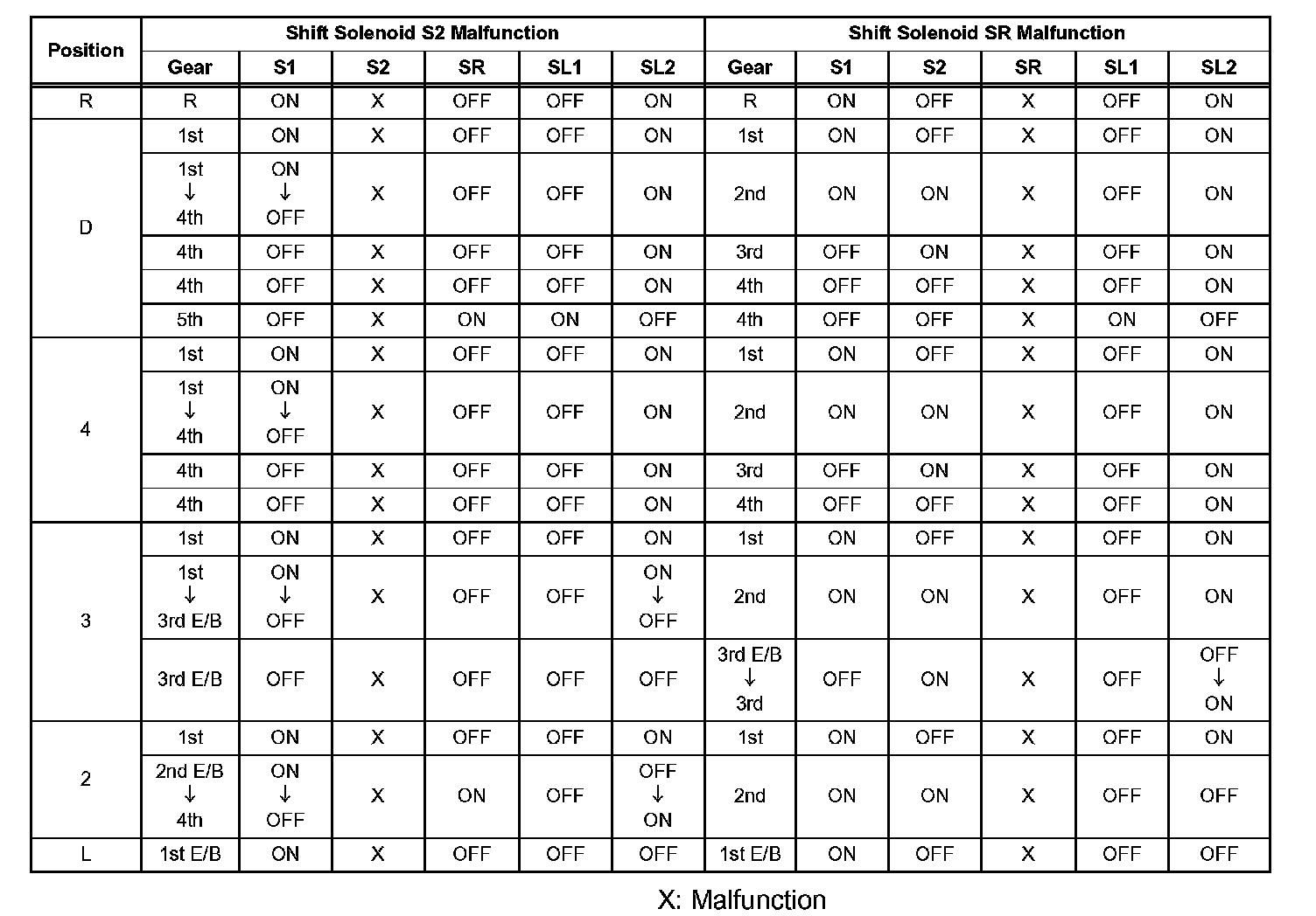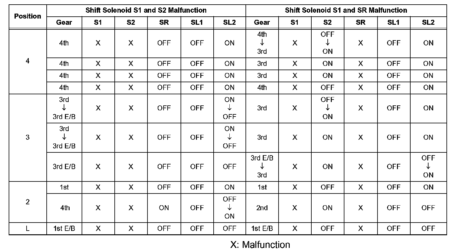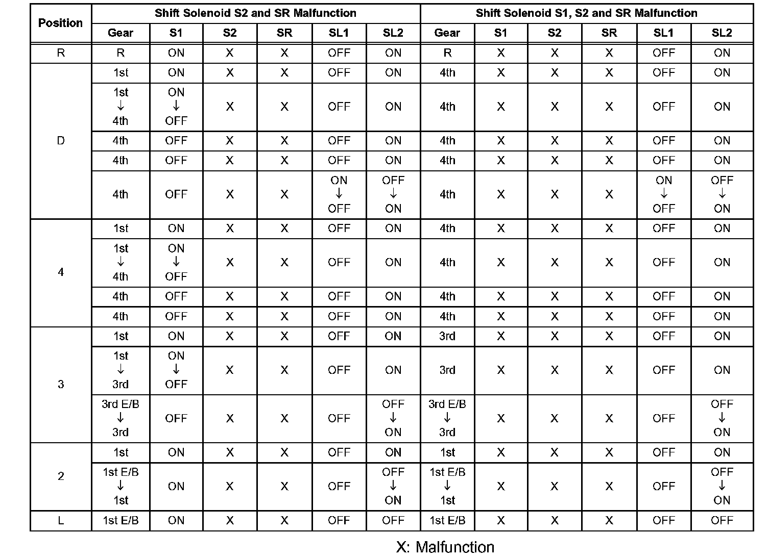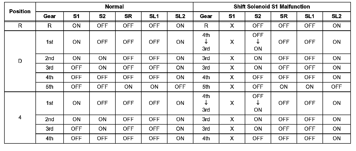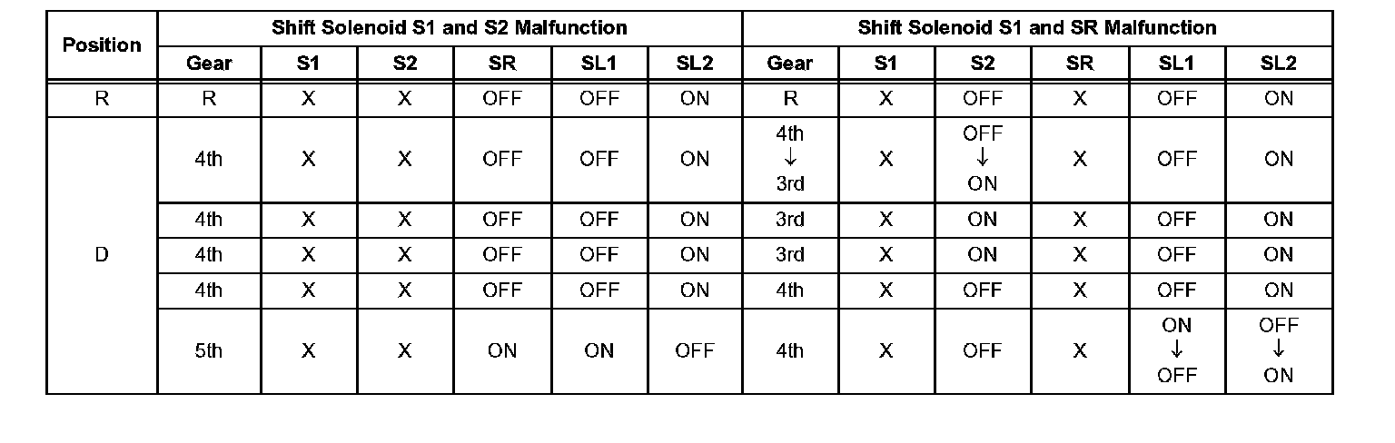 If either of the shift solenoid valve circuits has an open or short failure, the ECM turns the other shift solenoid ON and OFF in order to shift into the gear positions shown in the table.
