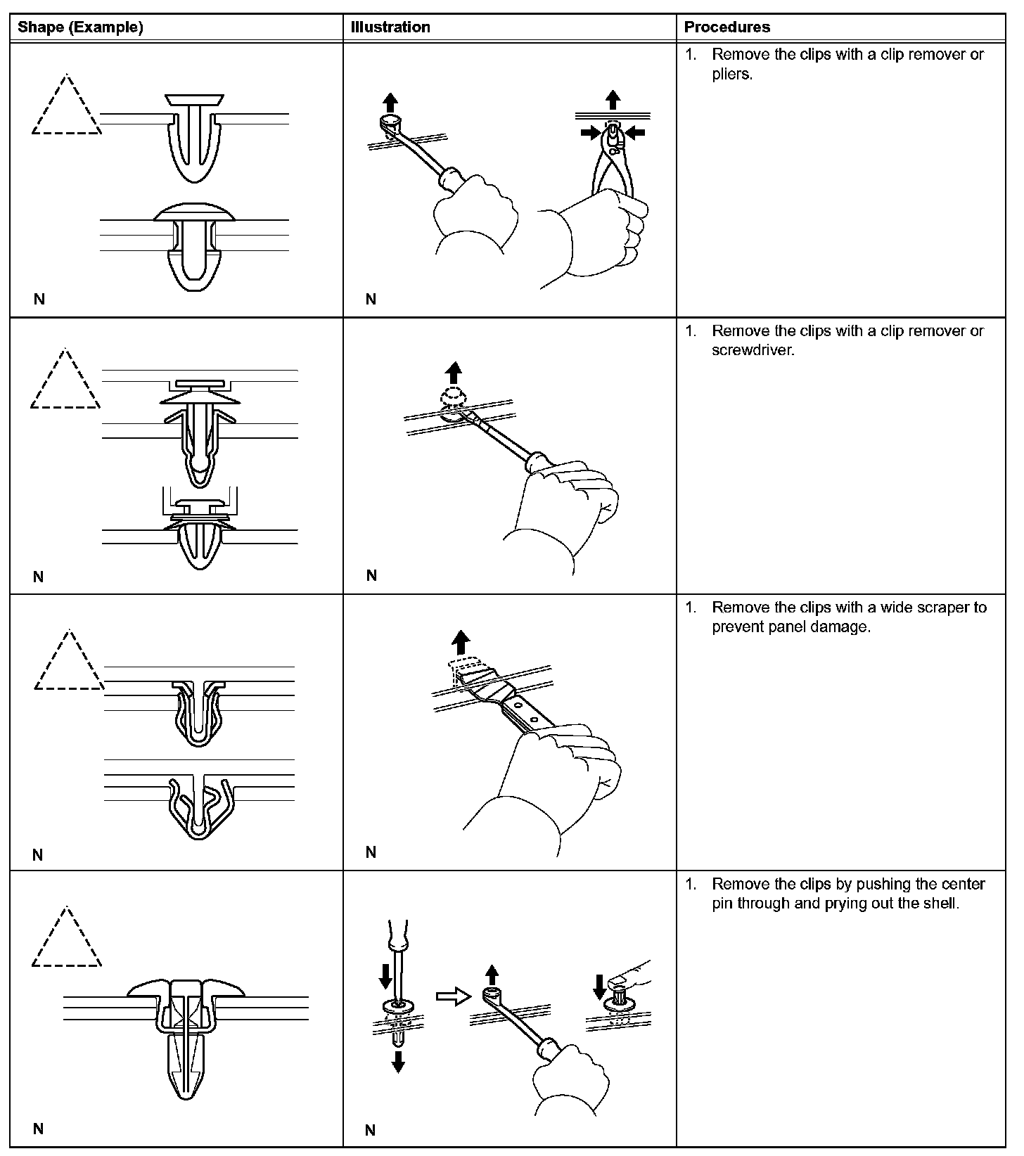1. The removal and installation methods of typical clips used for vehicle body parts are shown in the table.