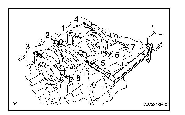 Using several steps, tighten the 8 main bearing cap bolts uniformly in the sequence shown in the illustration.