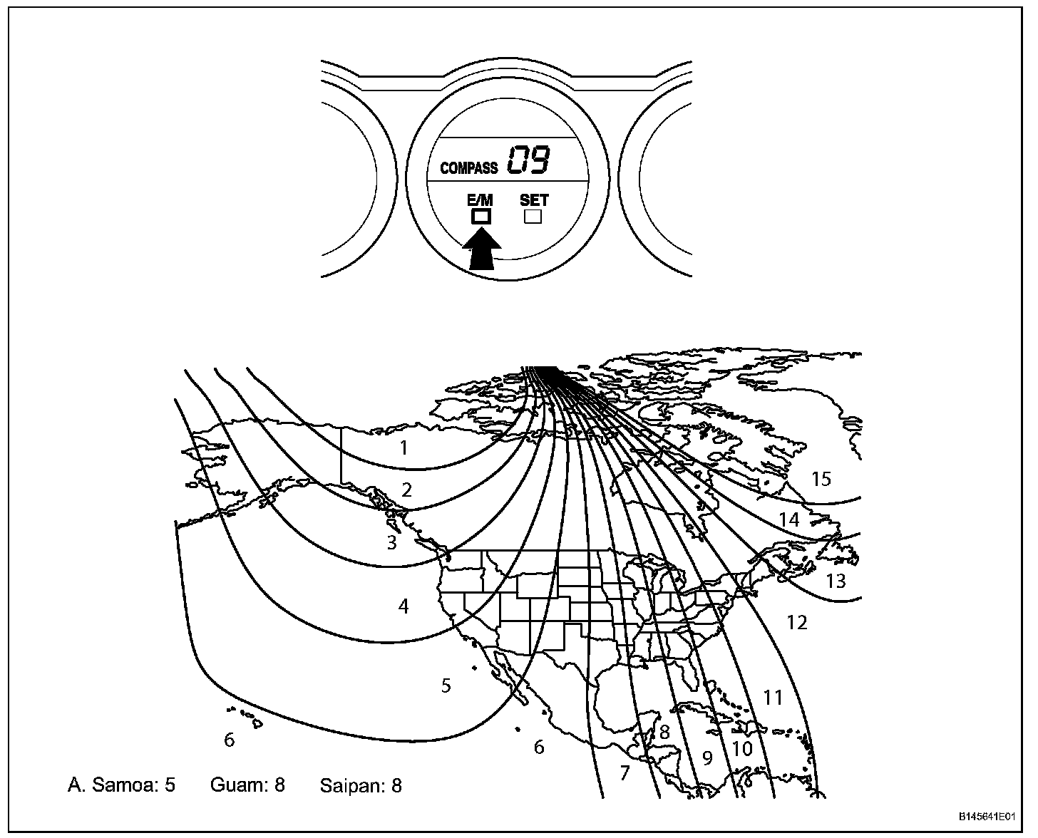 b. Compass function calibration is necessary when: 1) purchasing a vehicle; 2) disconnecting and reconnecting the cable of the negative (-) battery terminal; 3) replacing the vehicle battery; 4) driving the vehicle outside the set zone (see the zone map below); or 5) placing magnetic or metal objects near the accessory meter (the direction indication on the display blinks).