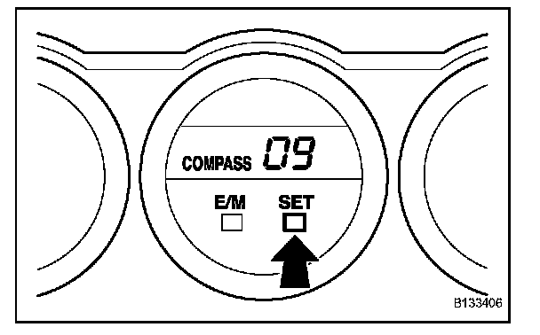 2. Switch the mode to compass correction mode by pushing the SET button for about 2 seconds, until the zone number appears in the outside temperature display.