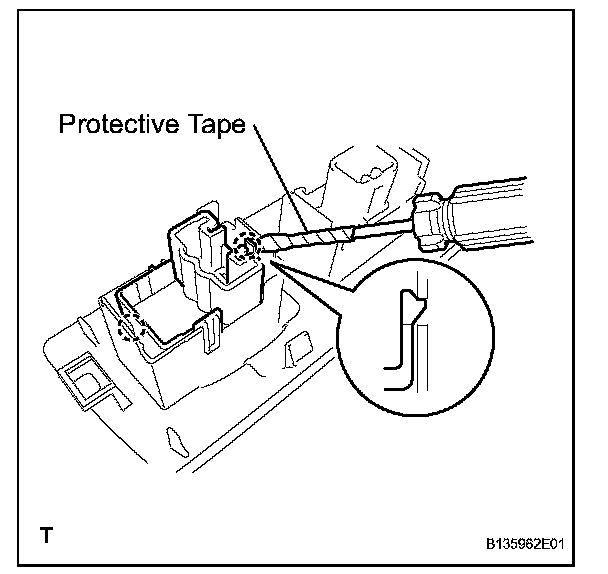 a. Using a screwdriver with its tip wrapped in protective tape, disengage the 2 claws and remove the power window regulator switch.