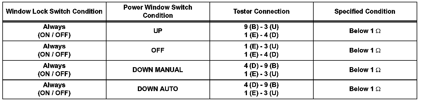 If the result is not as specified, replace the power window regulator master switch.