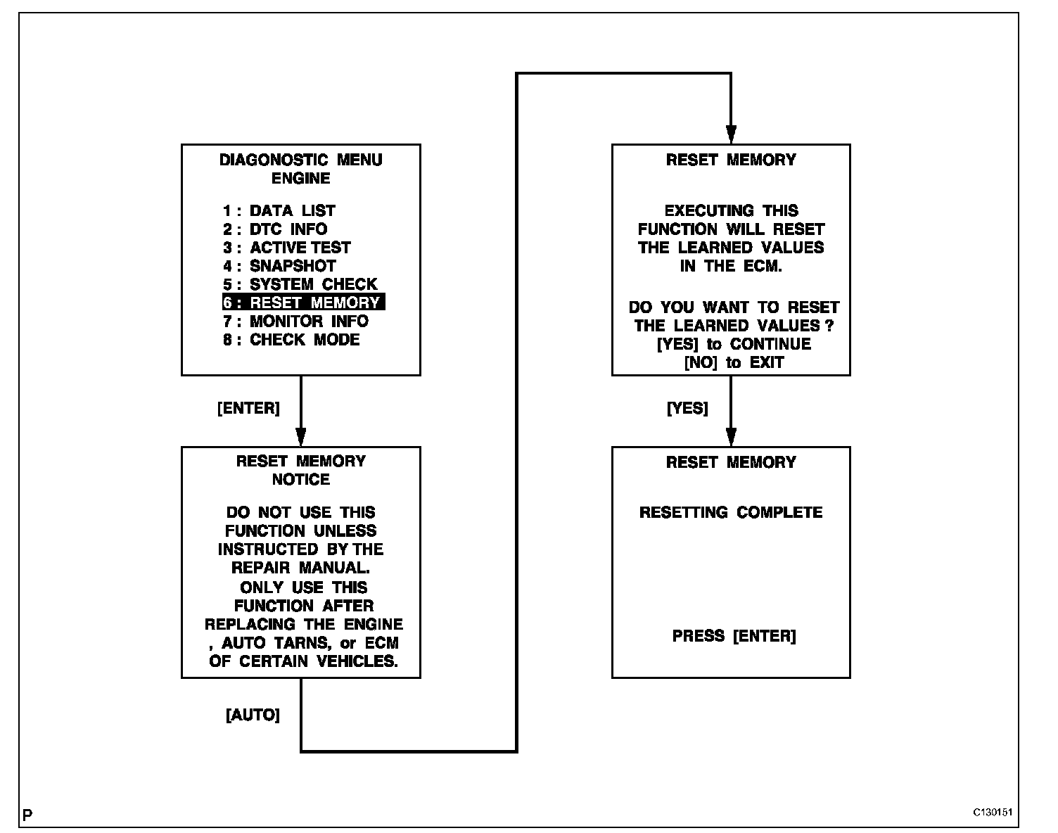 CAUTION: Perform the RESET MEMORY (AT initialization) when replacing the automatic transmission assembly, engine assembly or ECM.
