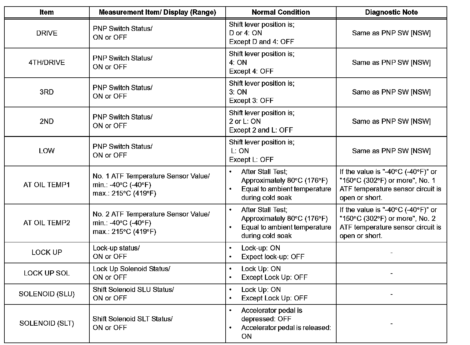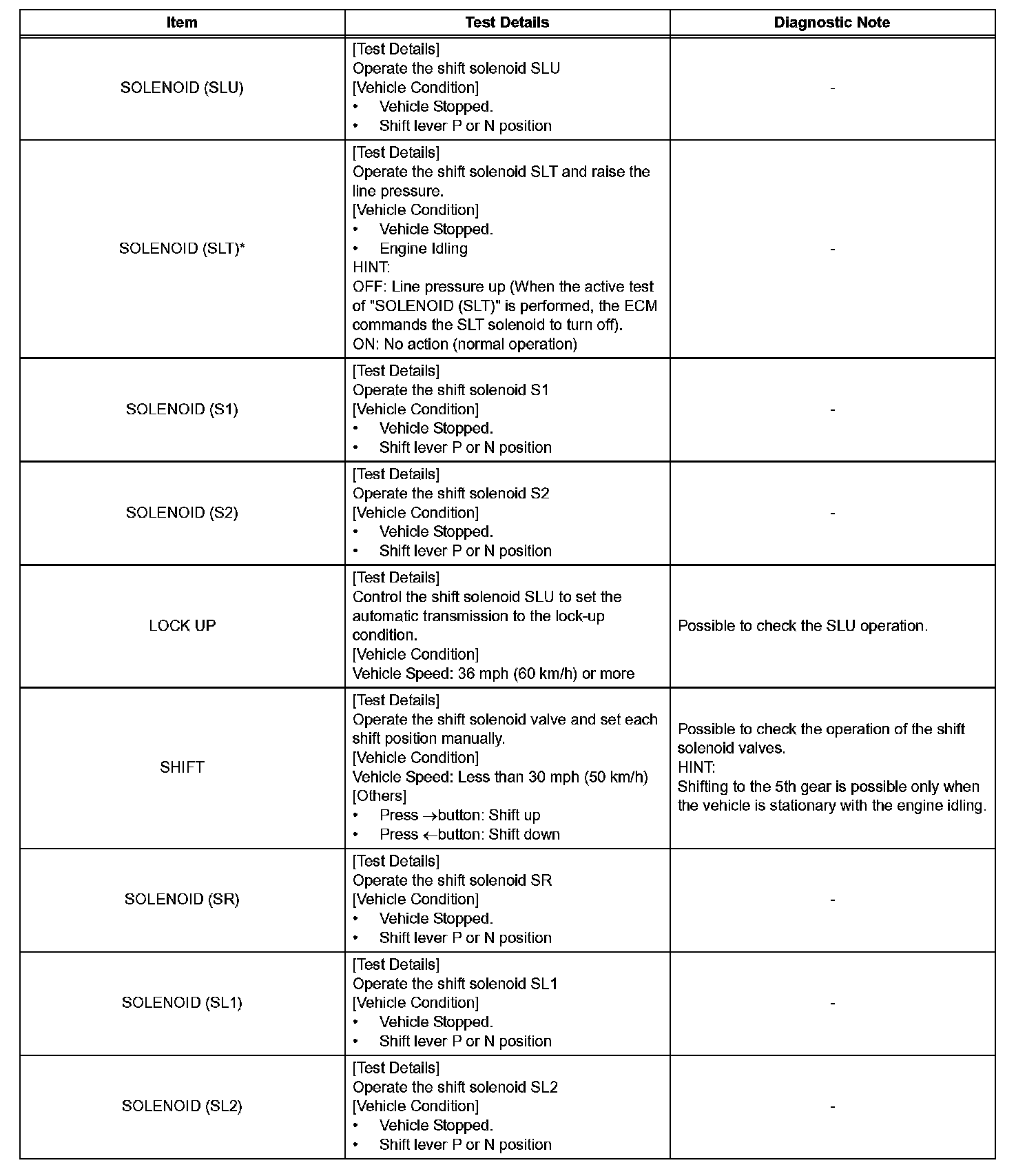 *: "SOLENOID (SLT)" in the ACTIVE TEST is performed to check the line pressure changes by connecting SST to the automatic transmission, which is used in the HYDRAULIC TEST as well.