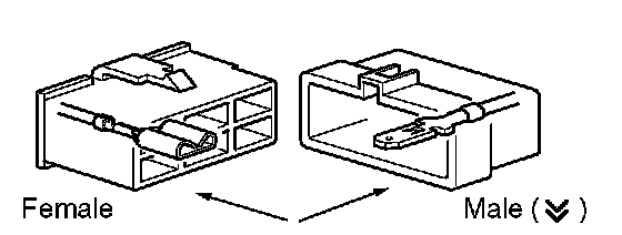 [E]: Indicates the wiring harness and wiring harness connector. The wiring harness with male terminal is shown with arrows.