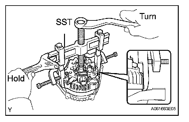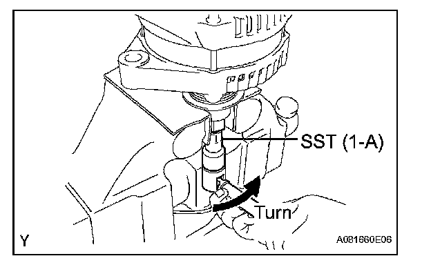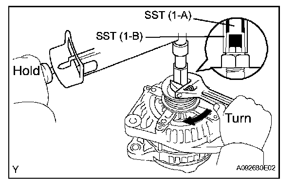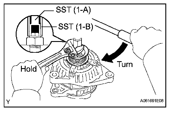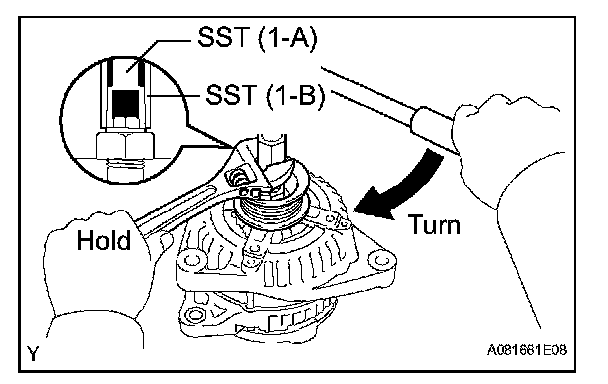 d. To loosen the pulley nut, turn SST (1-A) in the direction shown in the illustration.