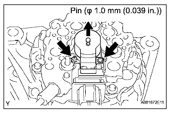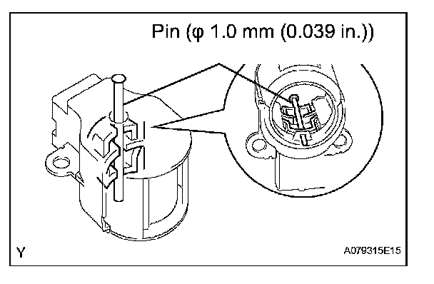 a. While pushing the 2 brushes to the inside of the brush holder, insert a pin (dia.1.0 mm (0.039 in.)) into the brush holder hole.