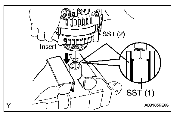d. Insert SST (1-A) and (1-B) into SST (2), and attach the generator pulley nut to SST (2).