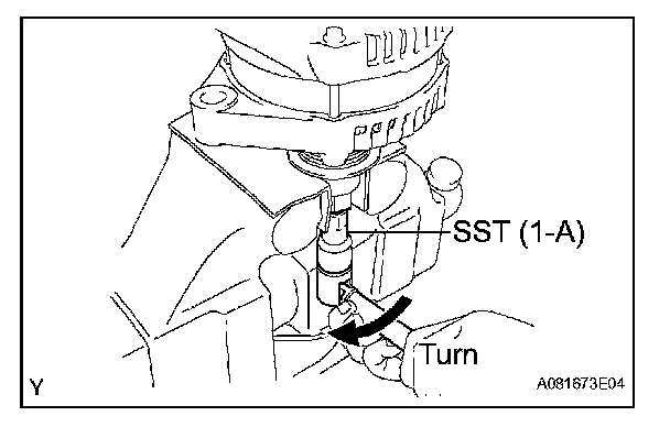 e. Tighten the pulley nut by turning SST (1-A) in the direction shown in the illustration.