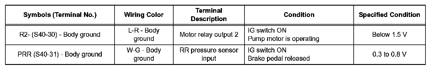 - Inspection should be performed from the back of the connector with the connector connected to the skid control ECU.