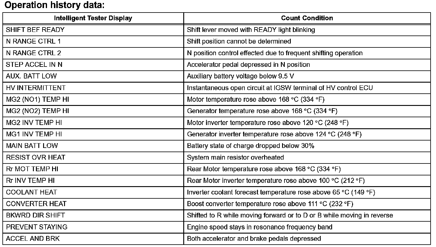 HINT: The HV control ECU records the special operations performed by the driver and the number of abnormal conditions that have been input to the ECU as operation history data.