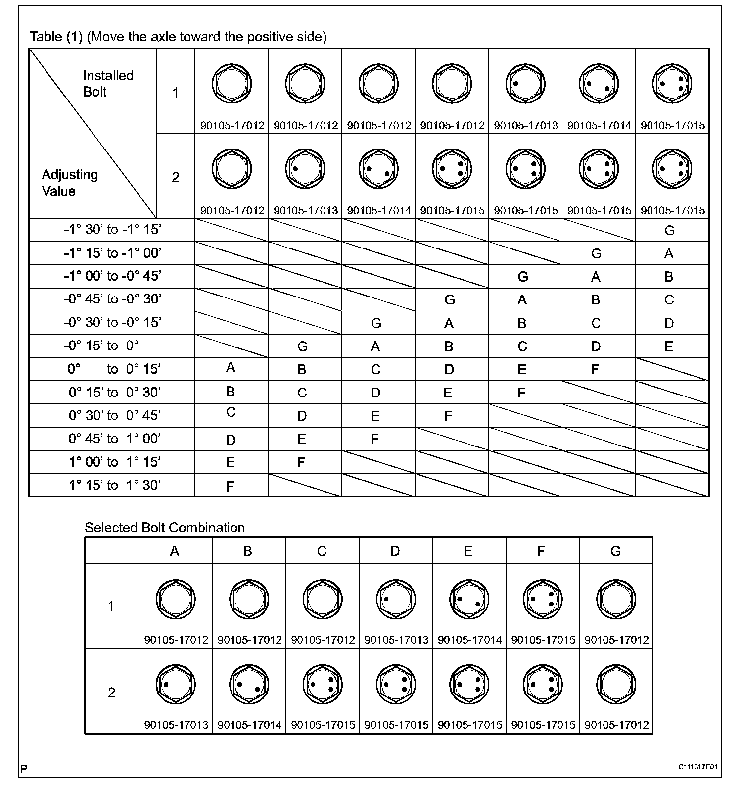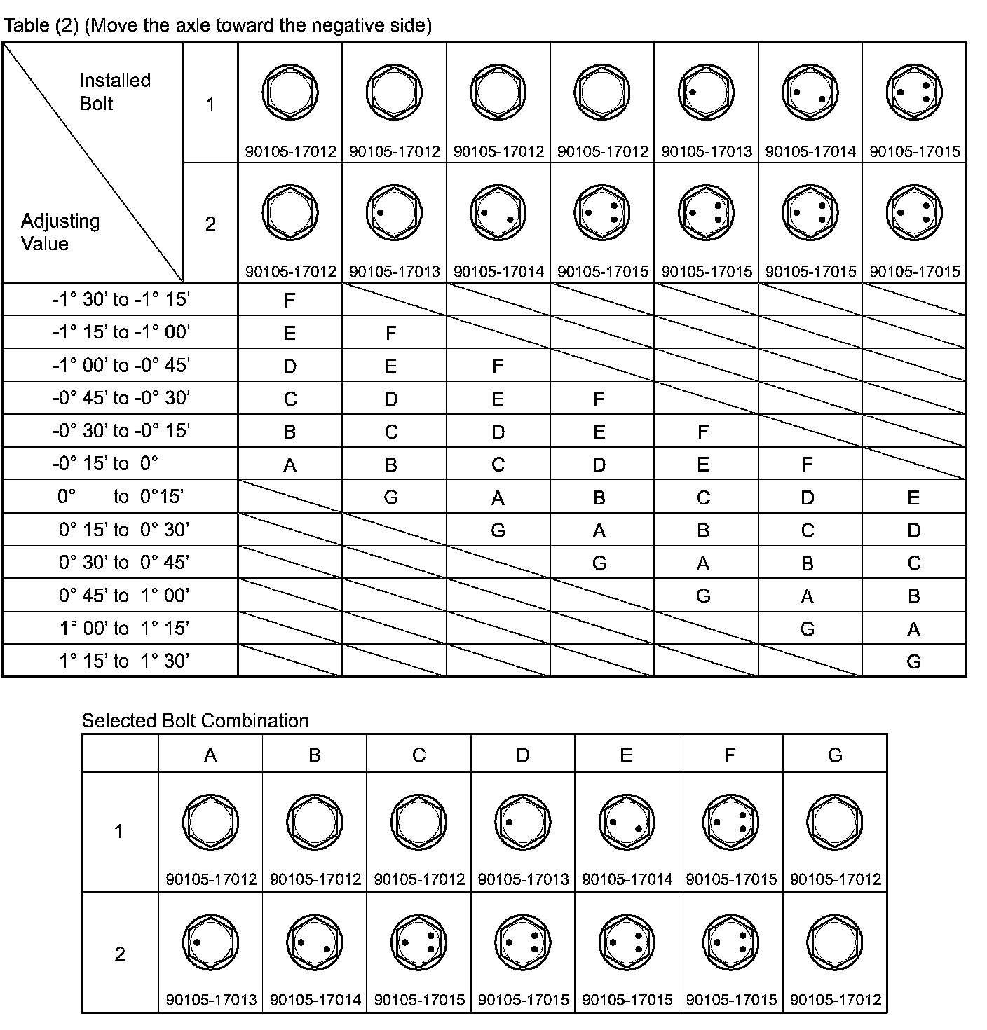 Check the combination of installed bolts. Select appropriate bolts from the table to adjust the camber to the specified value.