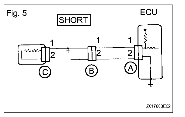 CHECK FOR SHORT CIRCUITa. If the wire harness is ground shorted (Fig.5), locate the section by conducting a resistance check with the body ground.