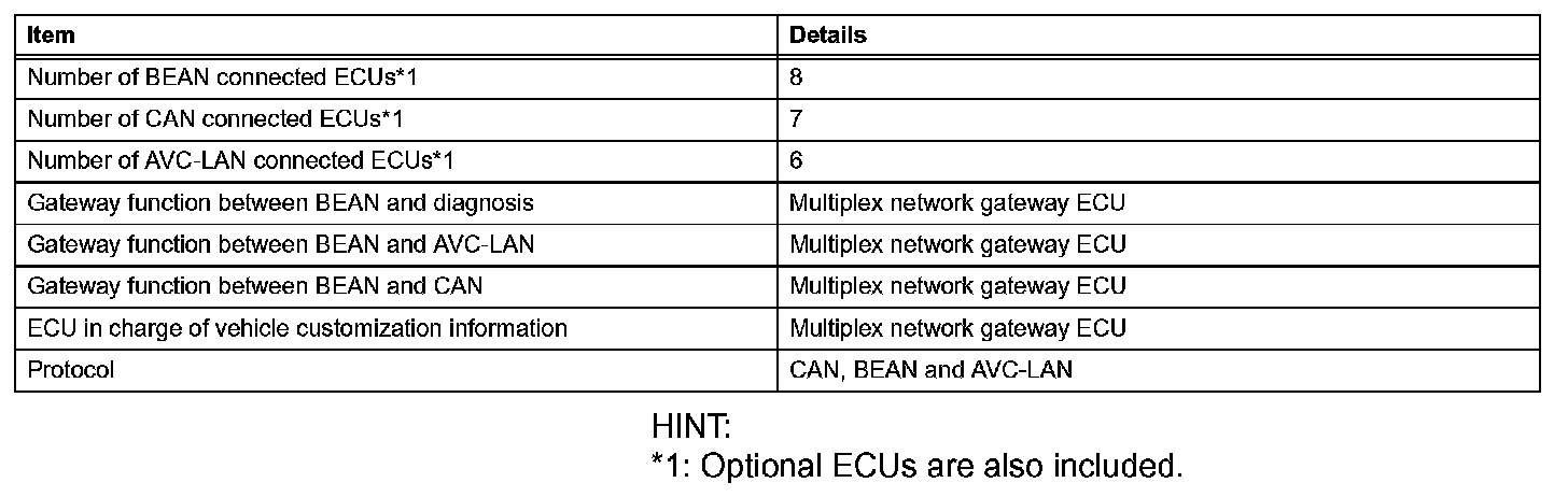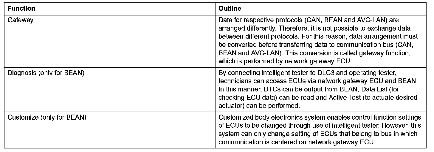 1. The CAN, BEAN and AVC-LAN protocols have set guidelines for data. The guidelines include communication speed, type of communication wire, drive type and data length. These guidelines are established to facilitate ECU data communication.