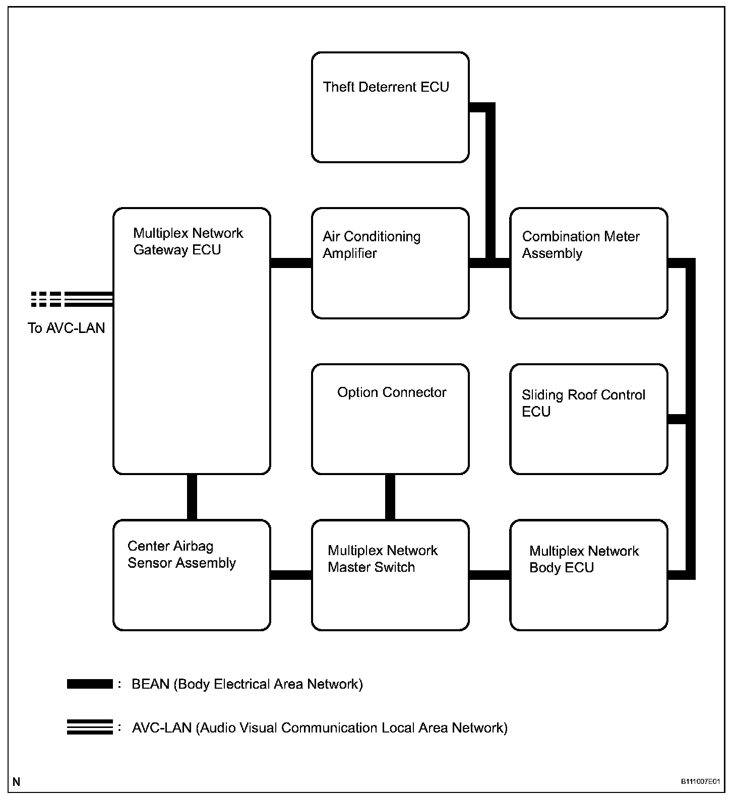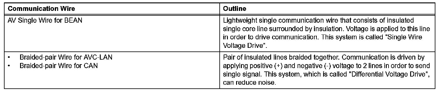 2. A single, Automobile Vinyl (AV) wire is used for BEAN communication. A braided-pair wire is used for CAN and AVC-LAN communication.