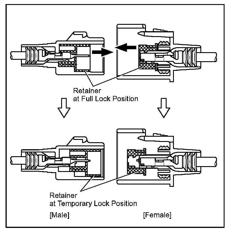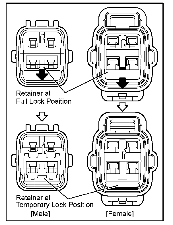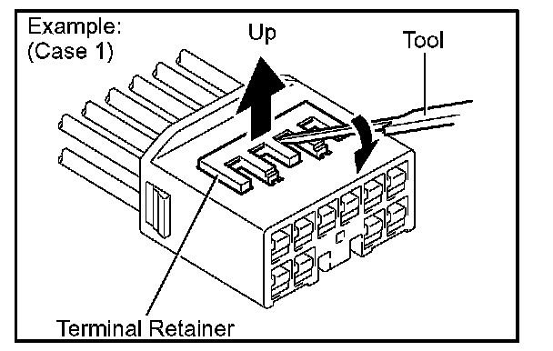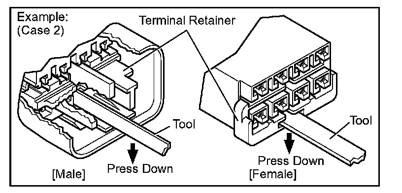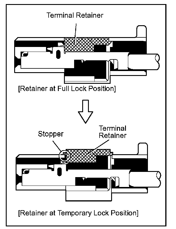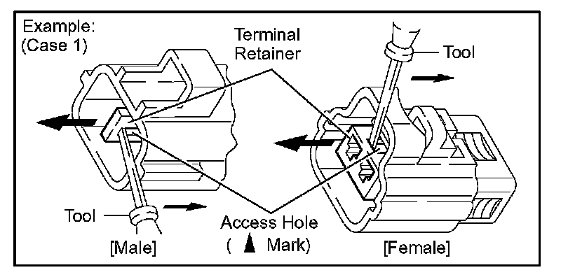 Insert the special tool into the terminal retainer access hole ( Mark) and pull the terminal retainer up to the temporary lock position.