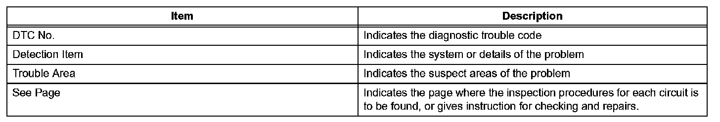 Look for output Diagnostic Trouble Codes (DTCs) (from the DTC checks) in the appropriate section's Diagnostic Trouble Code Chart. Use the chart to determine the trouble area and the proper inspection procedure. A description of each of the chart's columns is shown in the table.