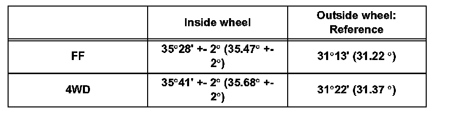 If the right and left inside wheel angles differ from the specified value, check and adjust the right and left rack end lengths.