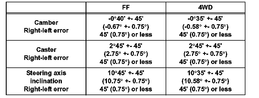 If the caster and steering axis inclination are not within the specified values after the camber has been correctly adjusted, recheck the suspension parts for damage and / or wear.