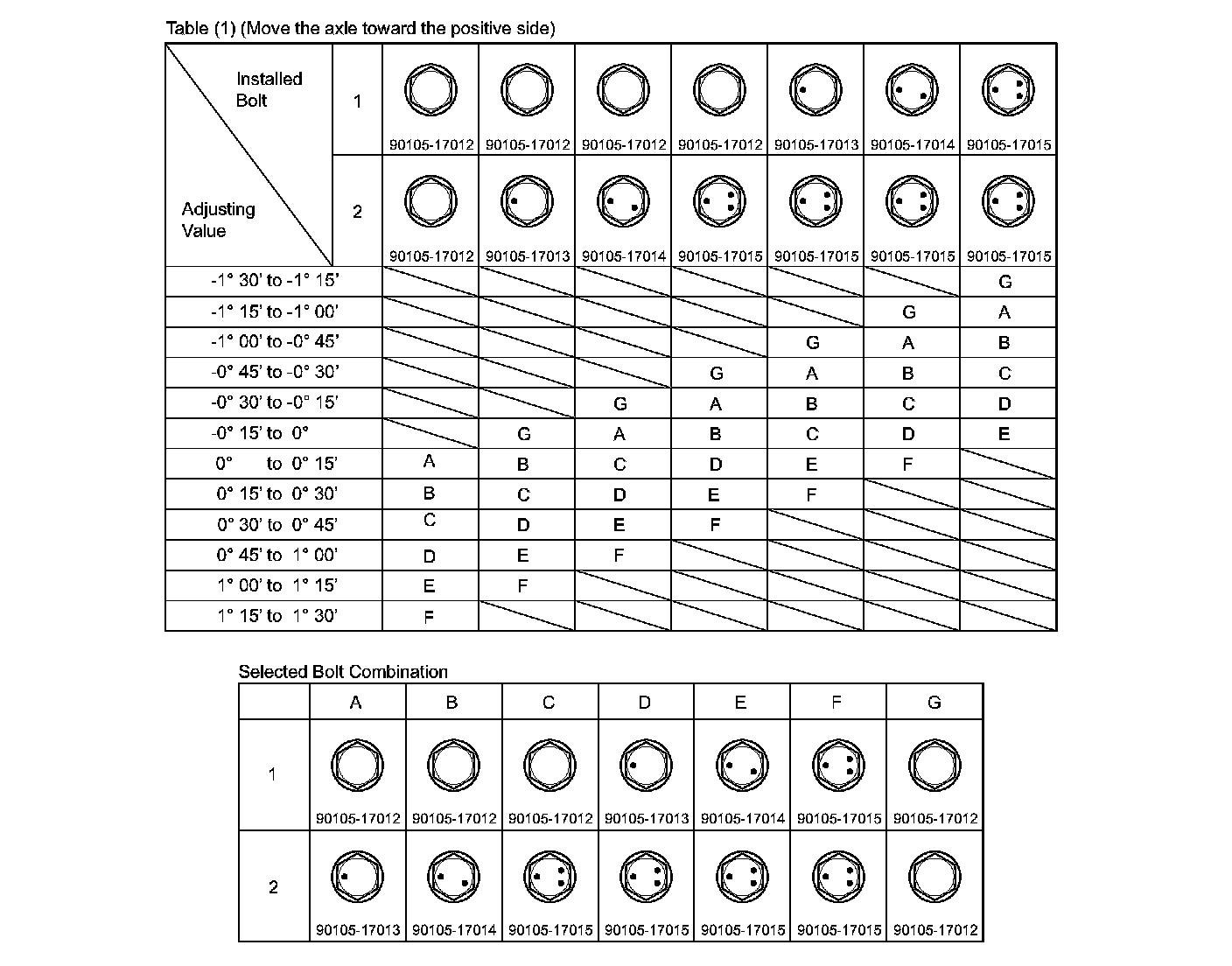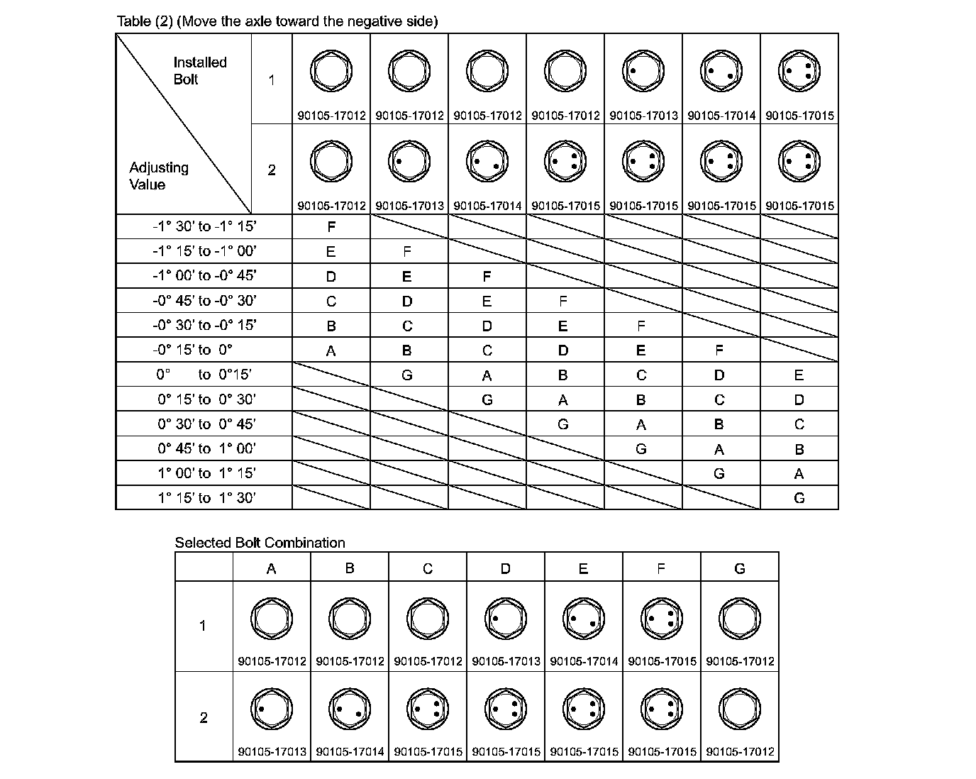 Check installed bolts combination. Select appropriate bolts from the table to adjust the camber to within the specified range.