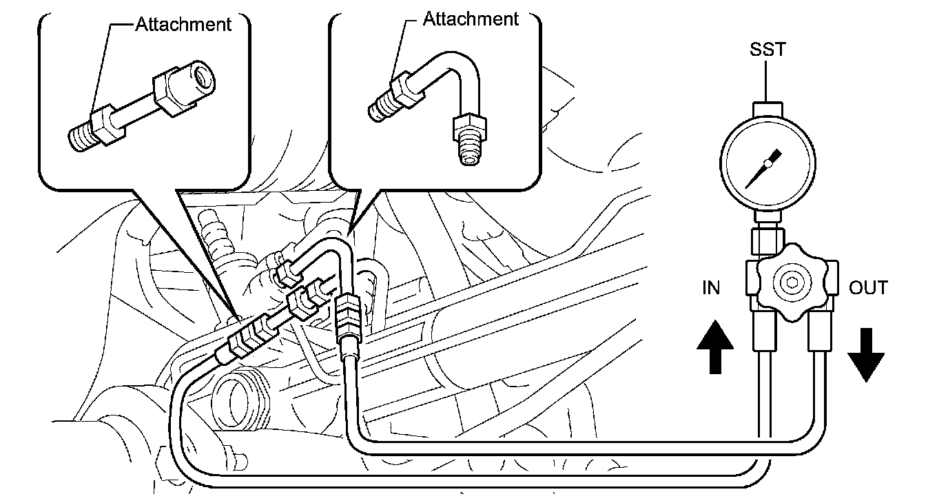 f. With the engine idling, close the valve of the SST and observe the reading on the SST