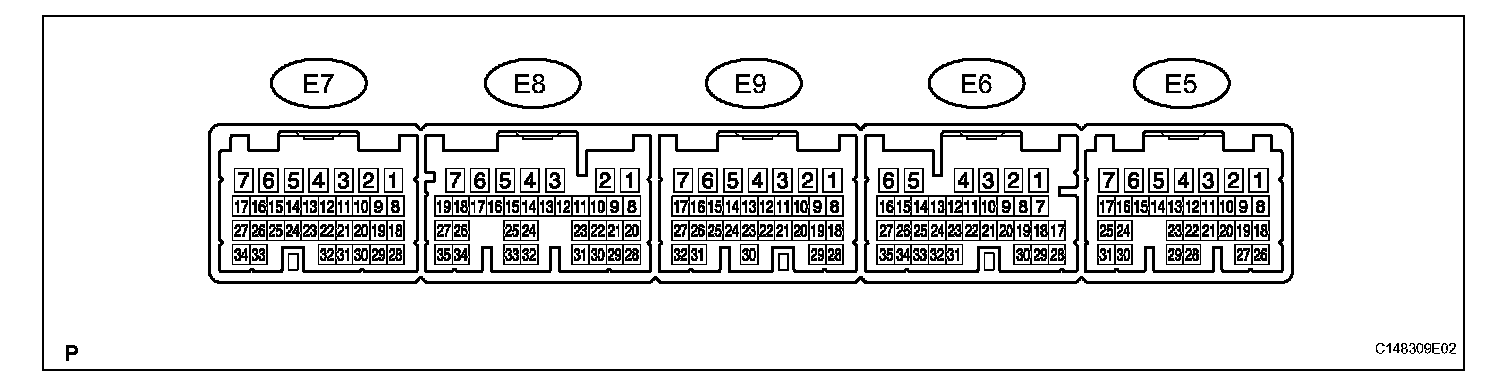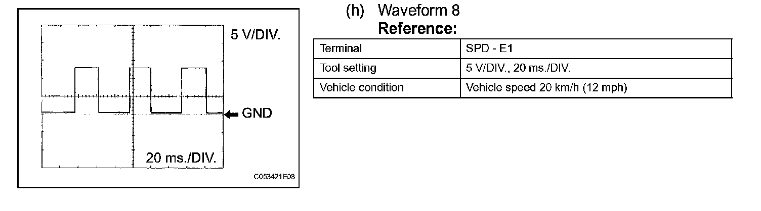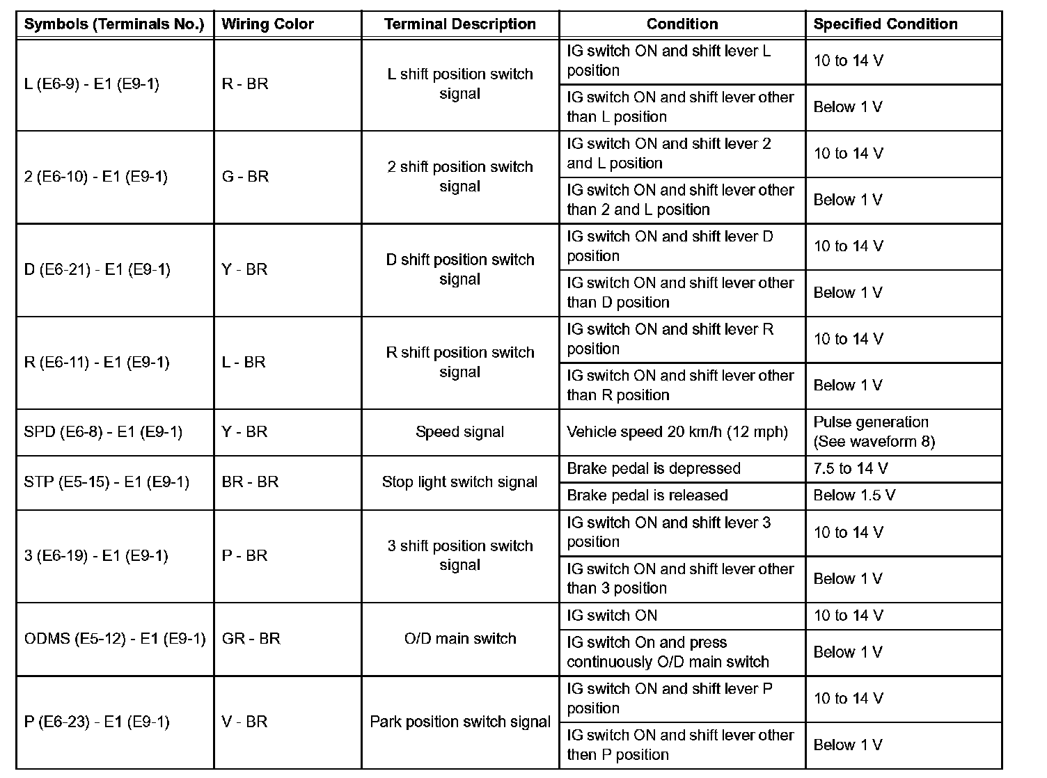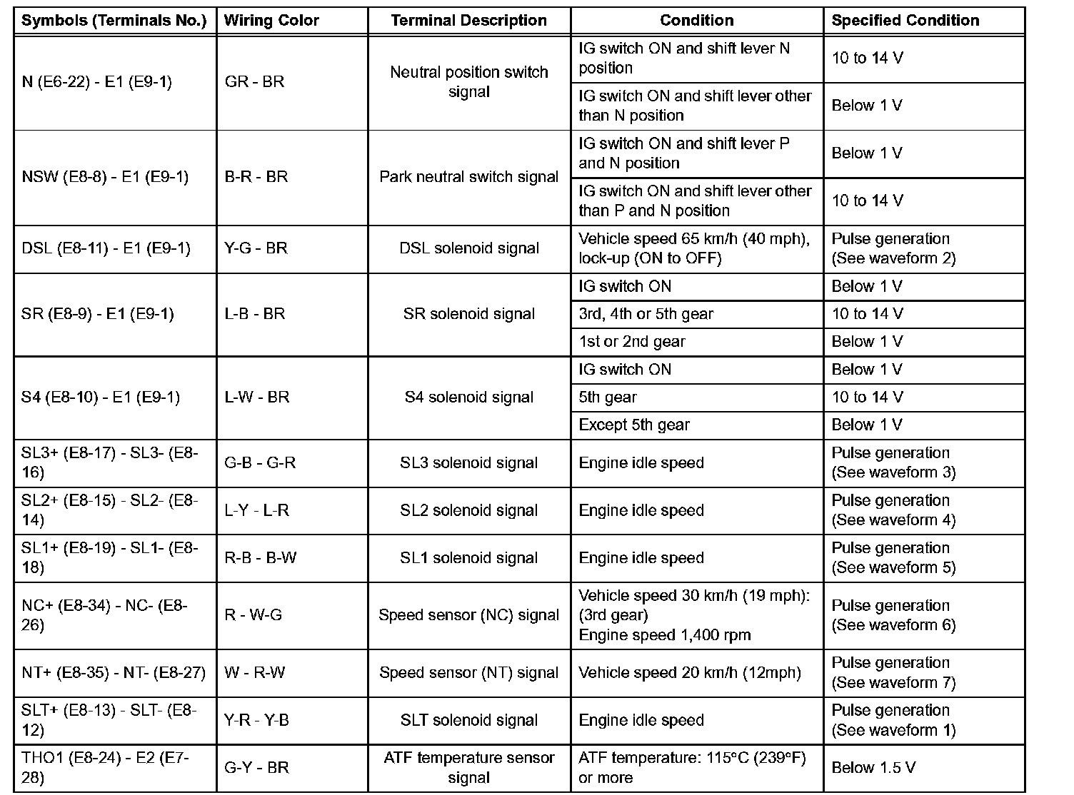 In the table, first follow the information under "Condition". Look under "Symbols (Terminal No.)" for the terminals to inspected. The standard voltage between the terminals is shown under "Specific Condition".