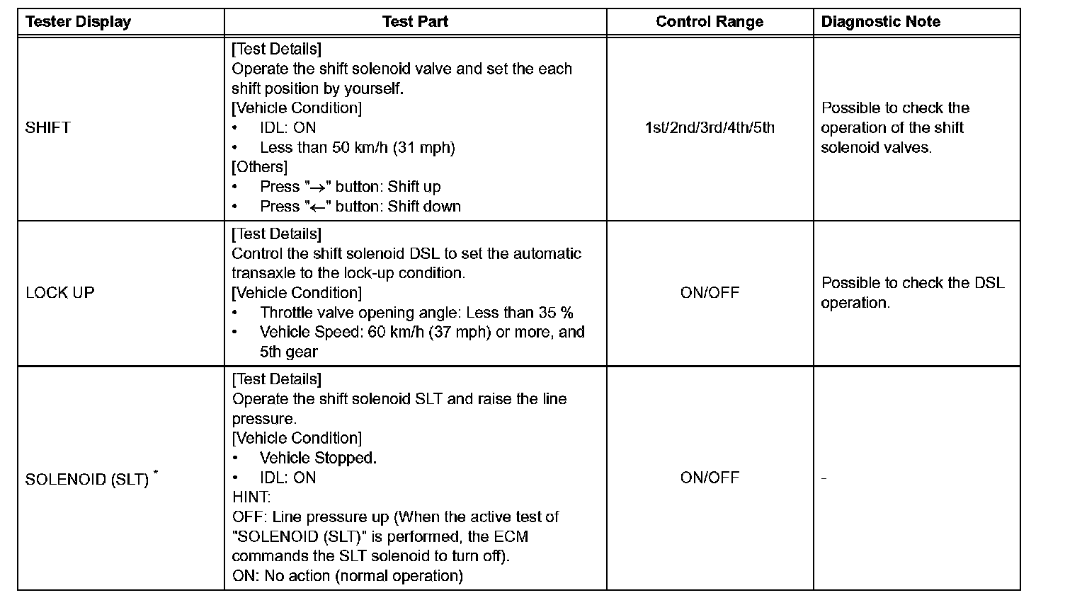 *: "SOLENOID (SLT)" in the ACTIVE TEST is performed to check the line pressure changes by connecting the SST to the automatic transaxle, which is used in the HYDRAULIC TEST as well. Hydraulic Test