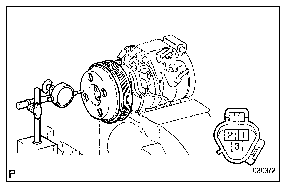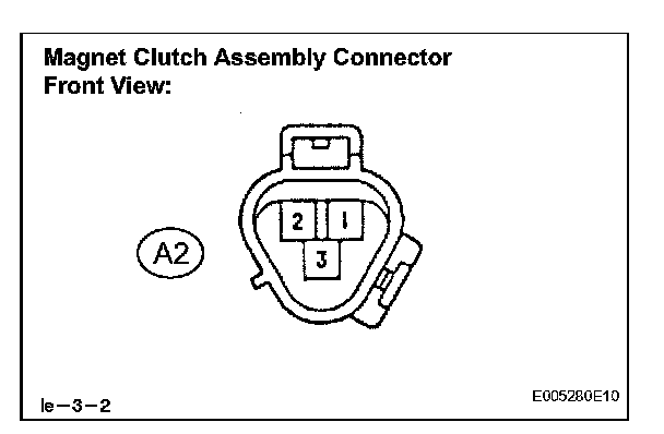 b. Connect the positive (+) lead from the battery to terminal 3 and negative (-) lead to body ground, then check that the magnet clutch assembly is engaged.