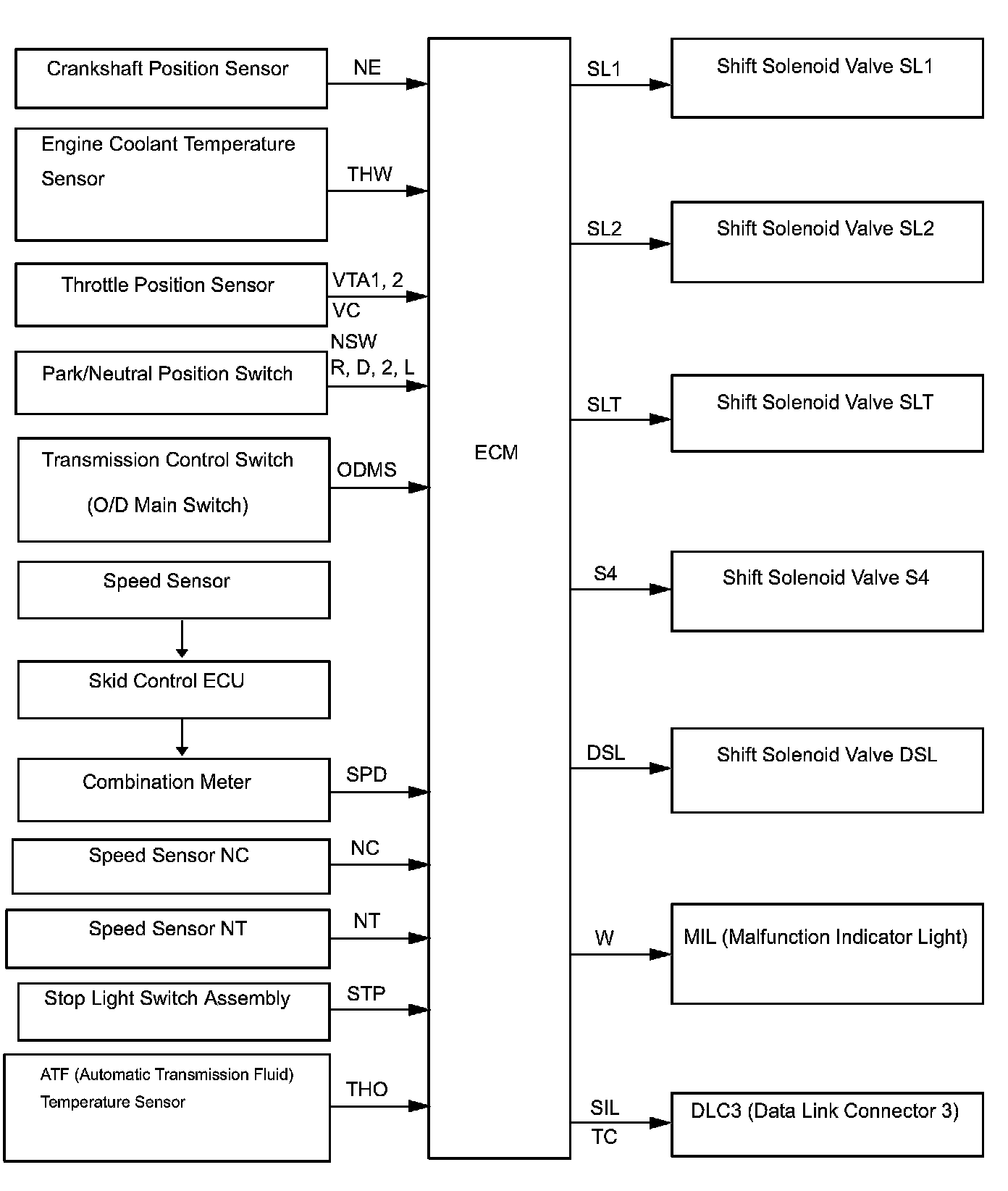 SYSTEM DIAGRAMThe configuration of the electronic control system in the U140F automatic transaxles is as shown in the following chart.