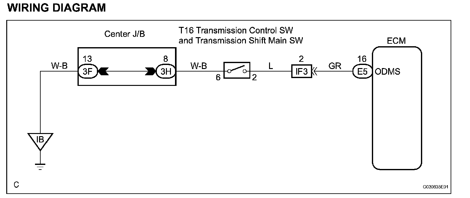 The O/D main switch (transmission control switch) is a momentary type switch. When pressing the O/D main switch, the O/D OFF indicator light lights up and the ECM prohibits shifting into O/D, and when pressing it once again, the O/D OFF indicator light goes off and the ECM allows shifting into O/D. Turning the IG switch OFF will reset the O/D OFF indicator light.