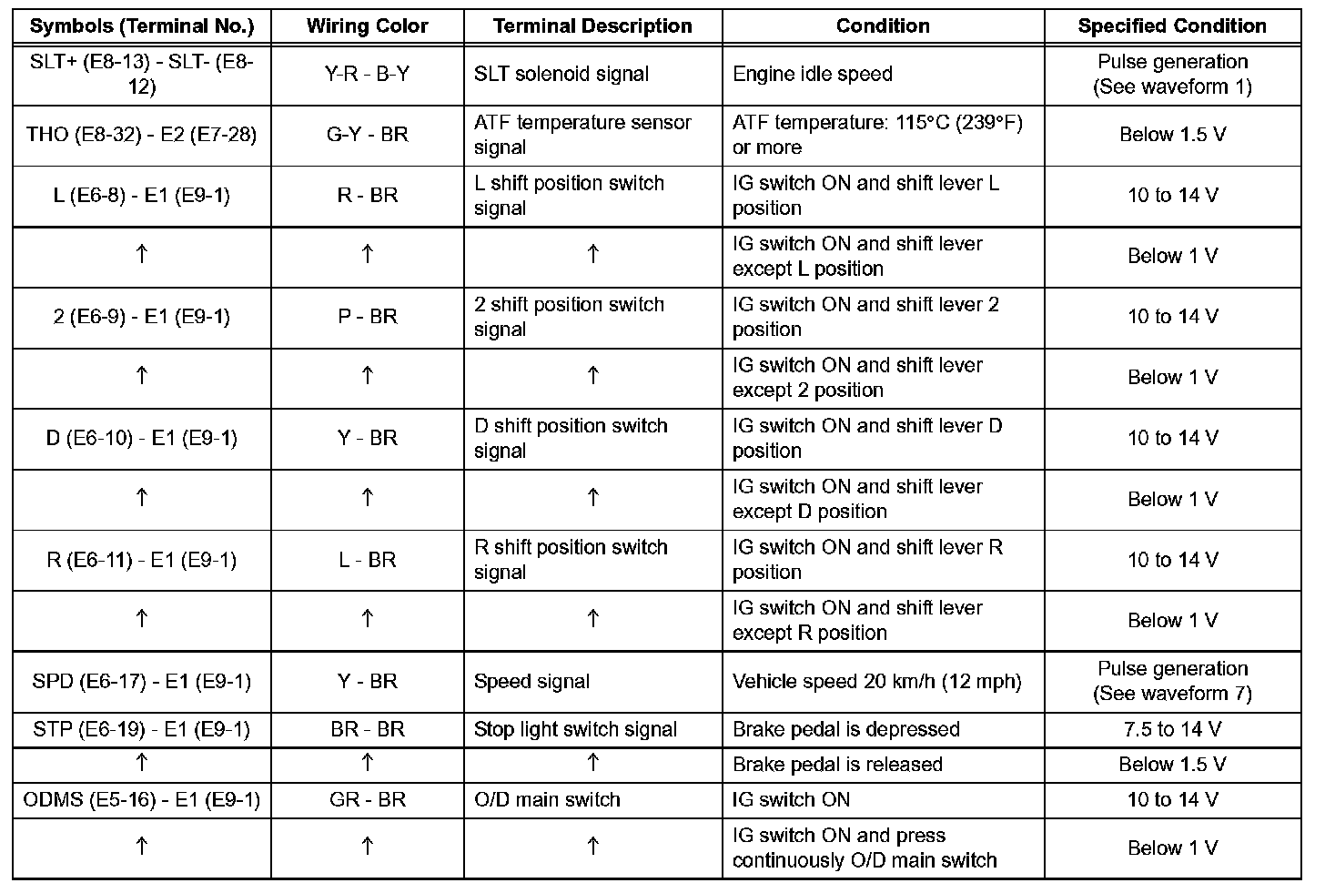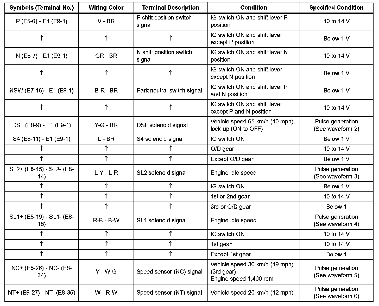 In the table, first follow the information under "Condition". Look under "Symbols (Terminal No.)" for the terminals to inspected. The standard voltage between the terminals is shown under "Specific Condition".