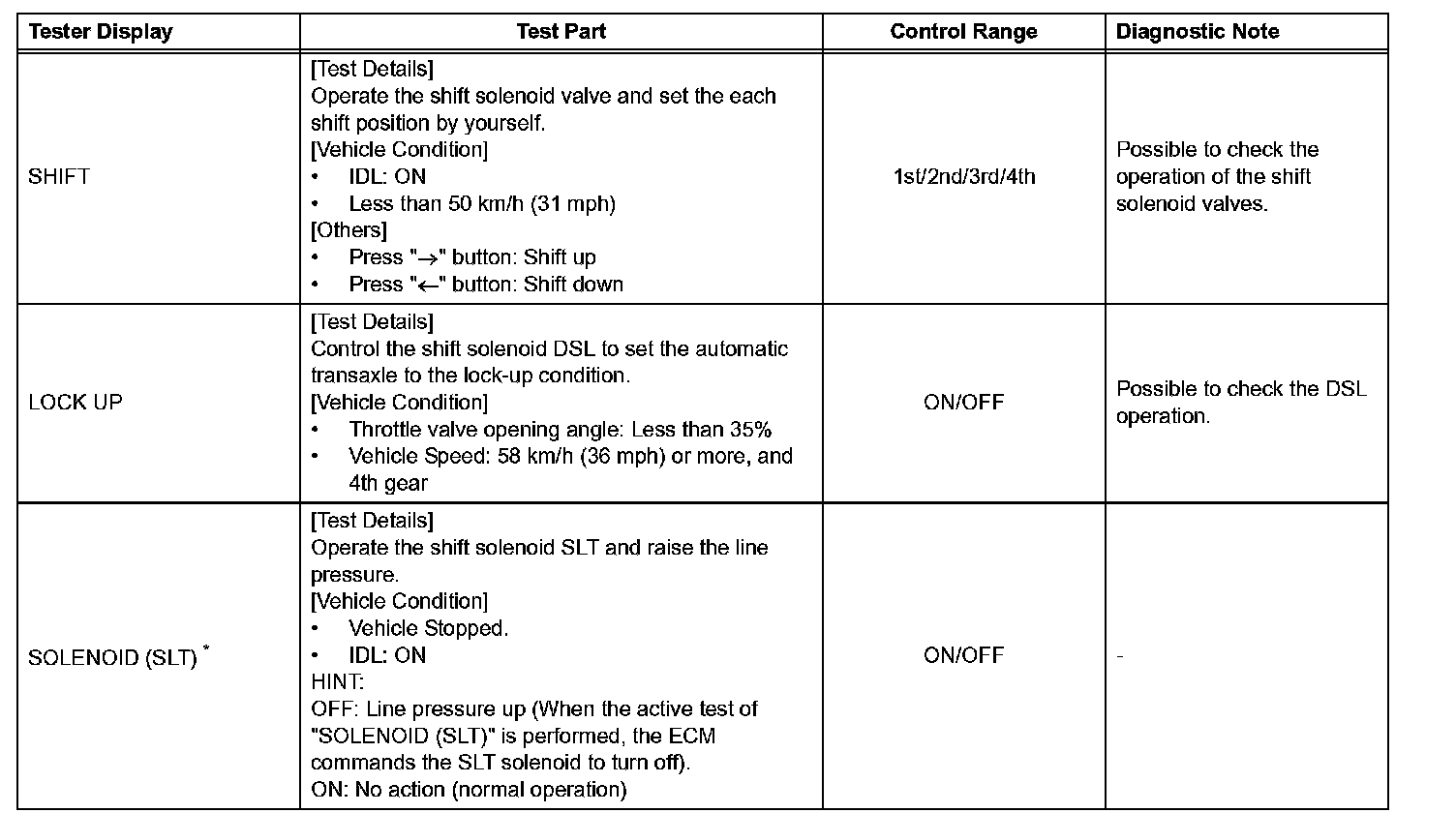 *: "SOLENOID (SLT)" in the ACTIVE TEST is performed to check the line pressure changes by connecting the SST to the automatic transaxle, which is used in the HYDRAULIC TEST as well. Hydraulic Test